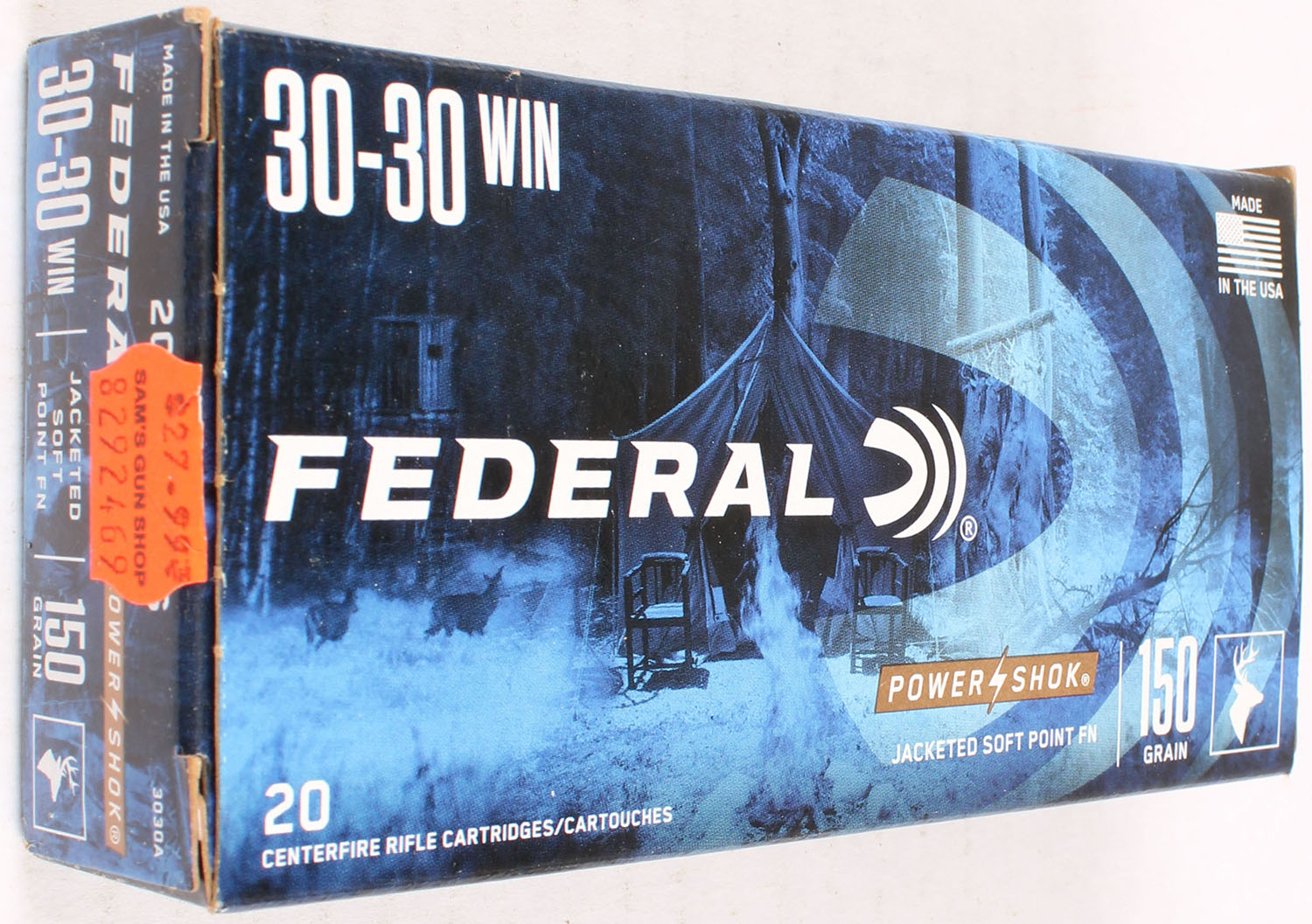 Federal, Power-Shok, 30-30 Win, 150 Grain Jacketed Soft Point FN, Full, 1pc., multi-colored box, box is solid with great color, end flaps are solid, ammo is excellent. Grade: Excellent + - Value: 10 to 50