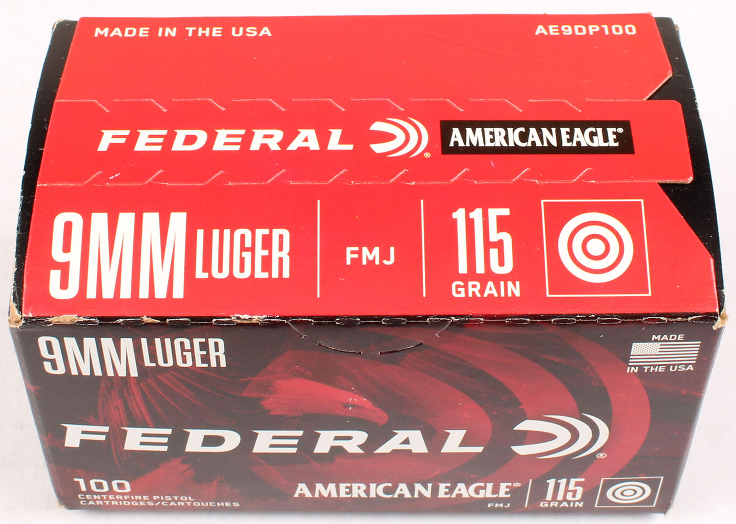 Federal, American Eagle, 9mm Luger, 115 Grain FMJ, FULL & SEALED, 1pc., multi-colored box, box is solid with great color, light edge & corner wear, end flaps are solid, ammo is excellent. Grade: Excellent + - Value: 10 to 50