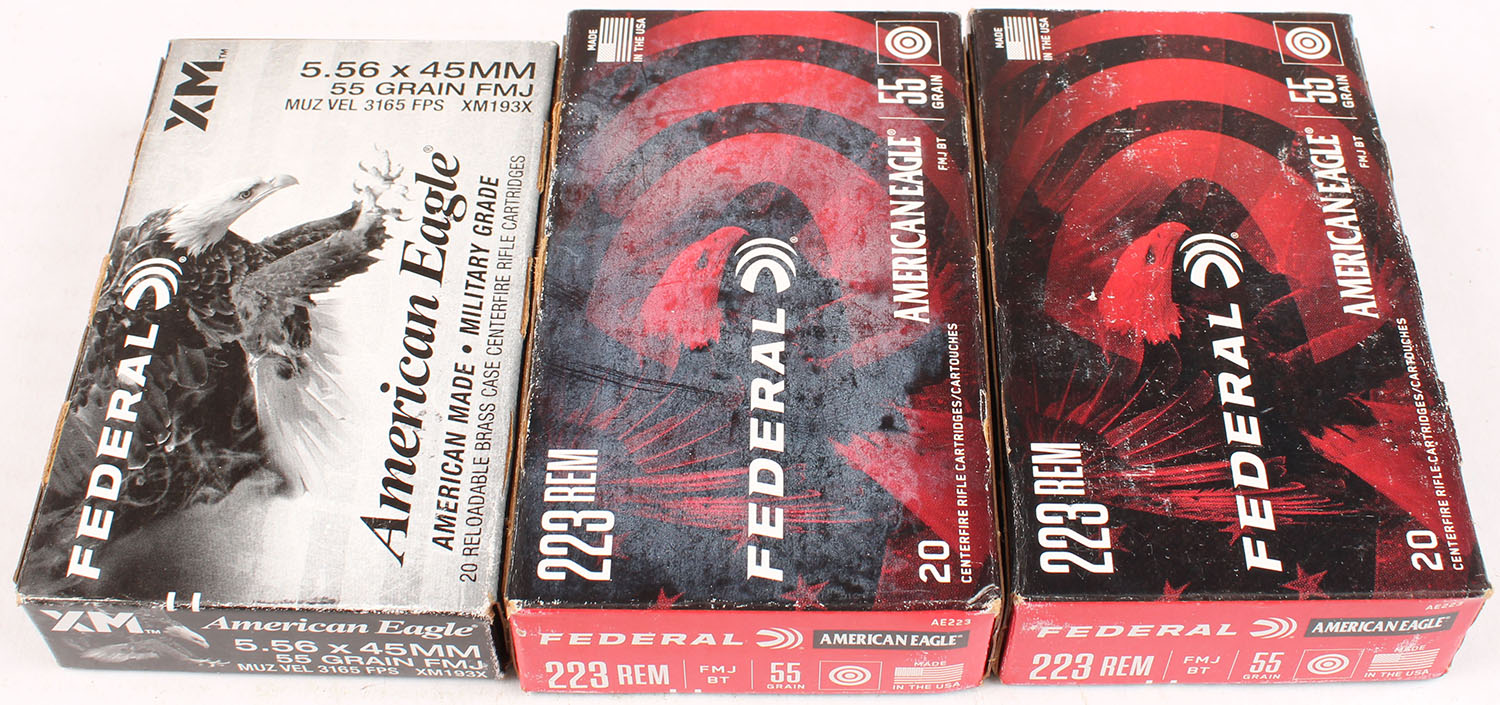 Lot of 3 Federal, American Eagle, 223 Rem/5.56x45mm, 55 Grain FMJ BT, FULL & SEALED, 1pc., multi-colored box, box is solid with good color, shelf wear, soiling, light edge & corner wear, end flaps are solid. Grade: Very Good ++ - Value: 10 to 50