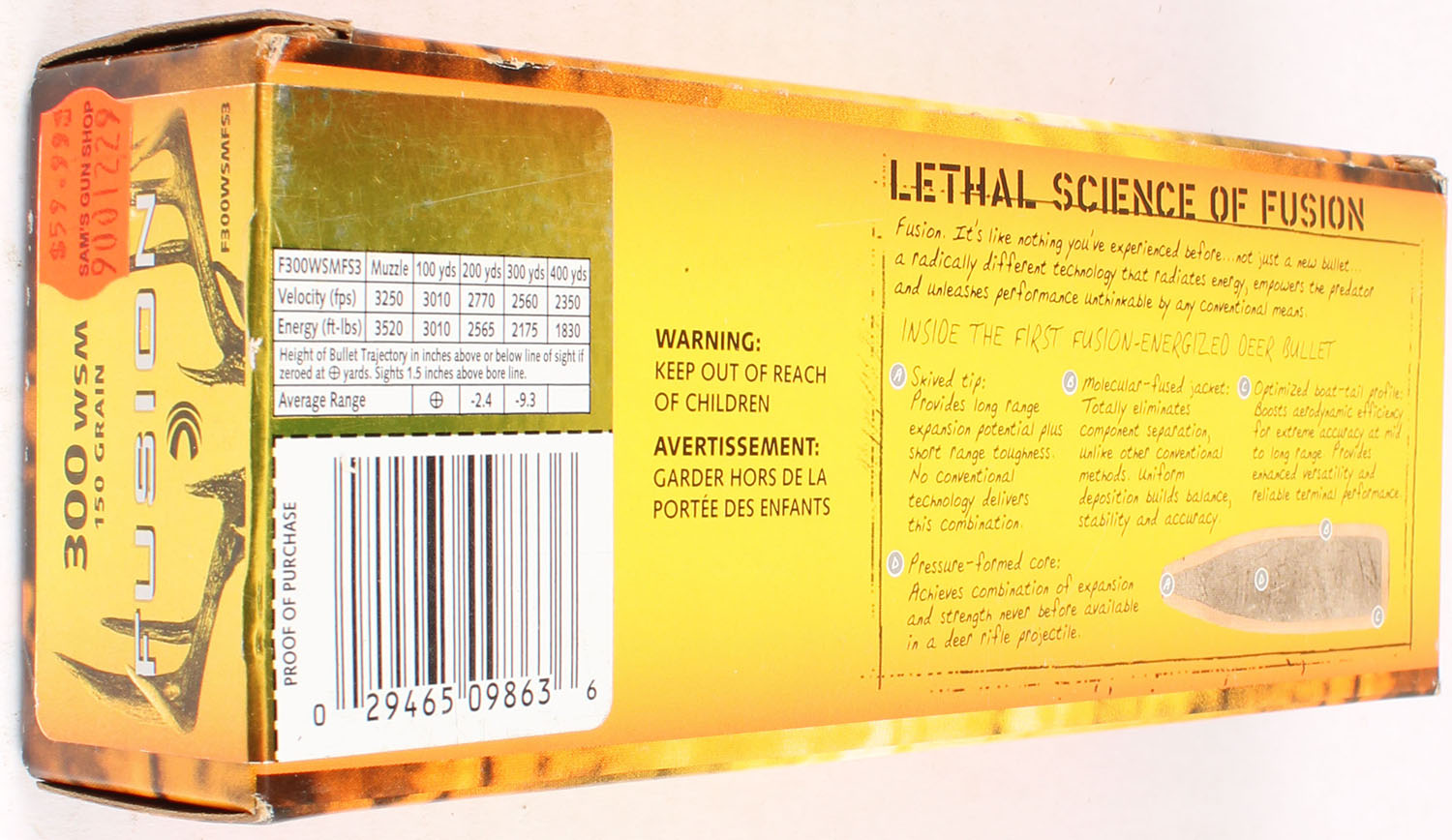 Federal, Fusion, 300 WSM, 150 Grain, Full, 1pc., multi-colored box, box is solid with great color, light corner wear, end flaps are solid, ammo is excellent. Grade: Excellent - Value: 20 to 80
