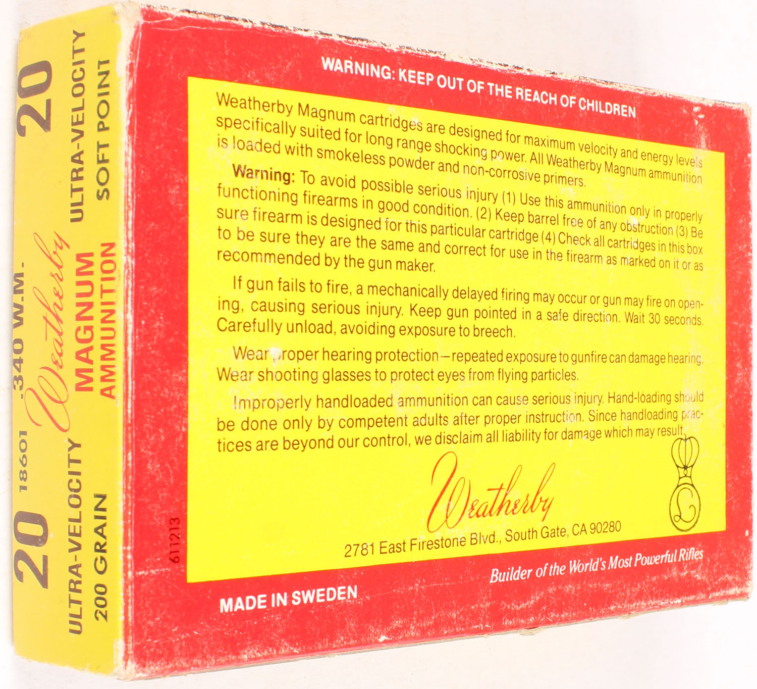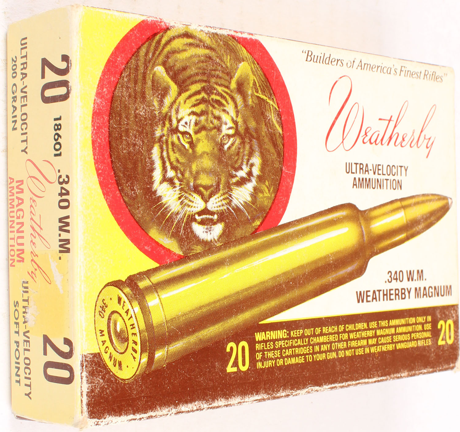 Weatherby, 340 W.M., 200 Grain Soft Point, Full, 1pc., multi-colored box, box is solid with very good color, light corner & edge wear, light shelf wear, end flaps are solid, ammo is excellent. Grade: Excellent - Value: 20 to 80