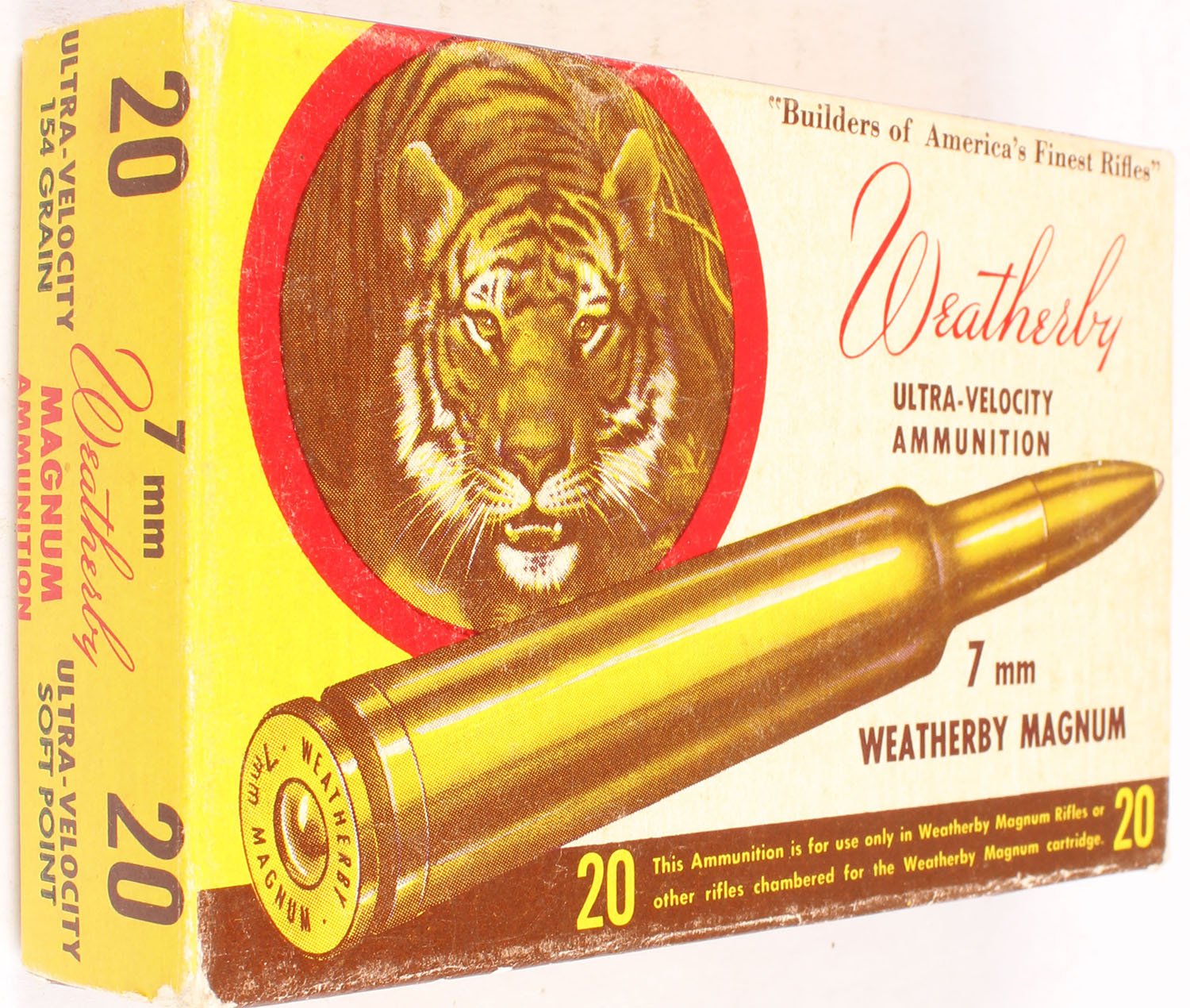 Weatherby, 7mm W.M., 154 Grain Ultra Velocity Soft Point, Full, 1pc., multi-colored box, box is solid with very good color, light corner & edge wear, light shelf wear, end flaps are solid, ammo is excellent. Grade: Excellent - Value: 20 to 80