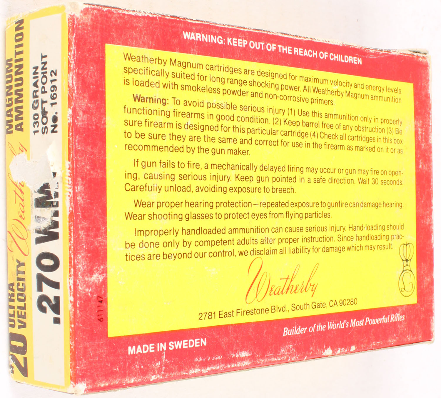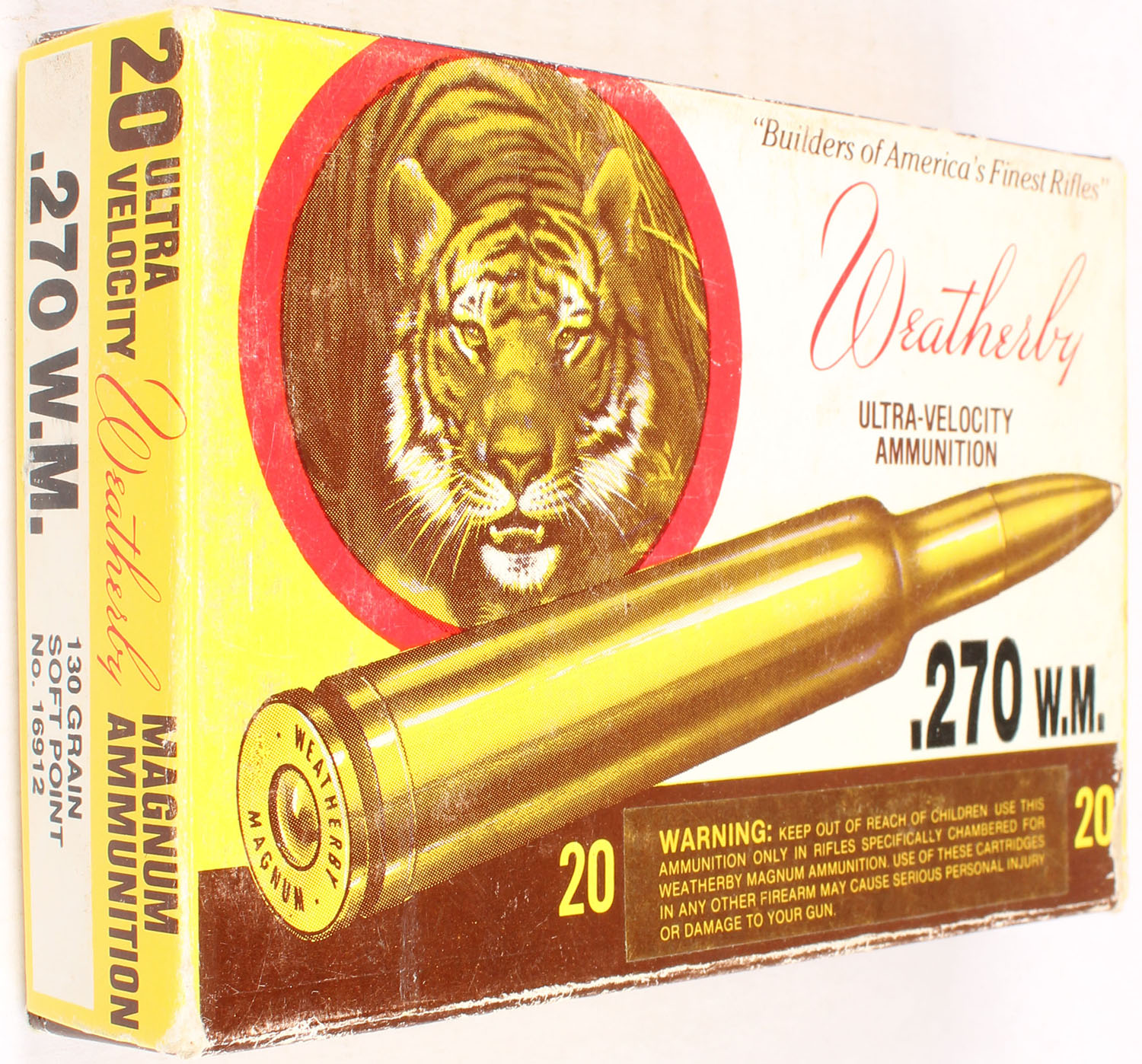 Weatherby, 270 W.M., 130 Grain Soft Point, Full, 1pc., multi-colored box, box is solid with very good color, corner & edge wear, light shelf wear, light scuffing, end flaps are solid, ammo is excellent. Grade: Very Good ++ - Value: 20 to 80