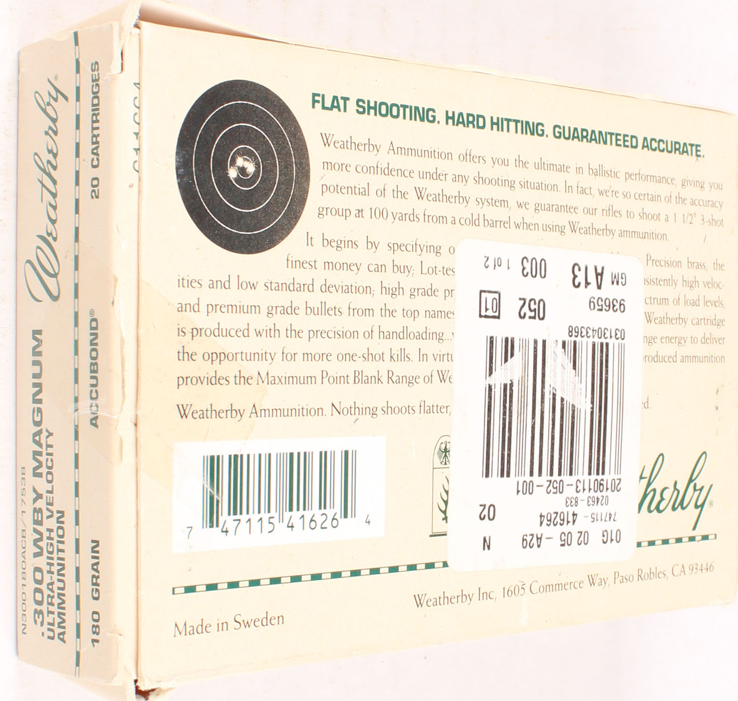 Weatherby, 300 WBY Magnum, 180 Grain Ultra High Velocity Accubond, Full with 3rds being fired empties & 2rds having broken polymer tips, 1pc., multi-colored box, box has very good color, light corner & edge wear, small tears, ammo is very good. Grade: Very Good ++ - Value: 20 to 80