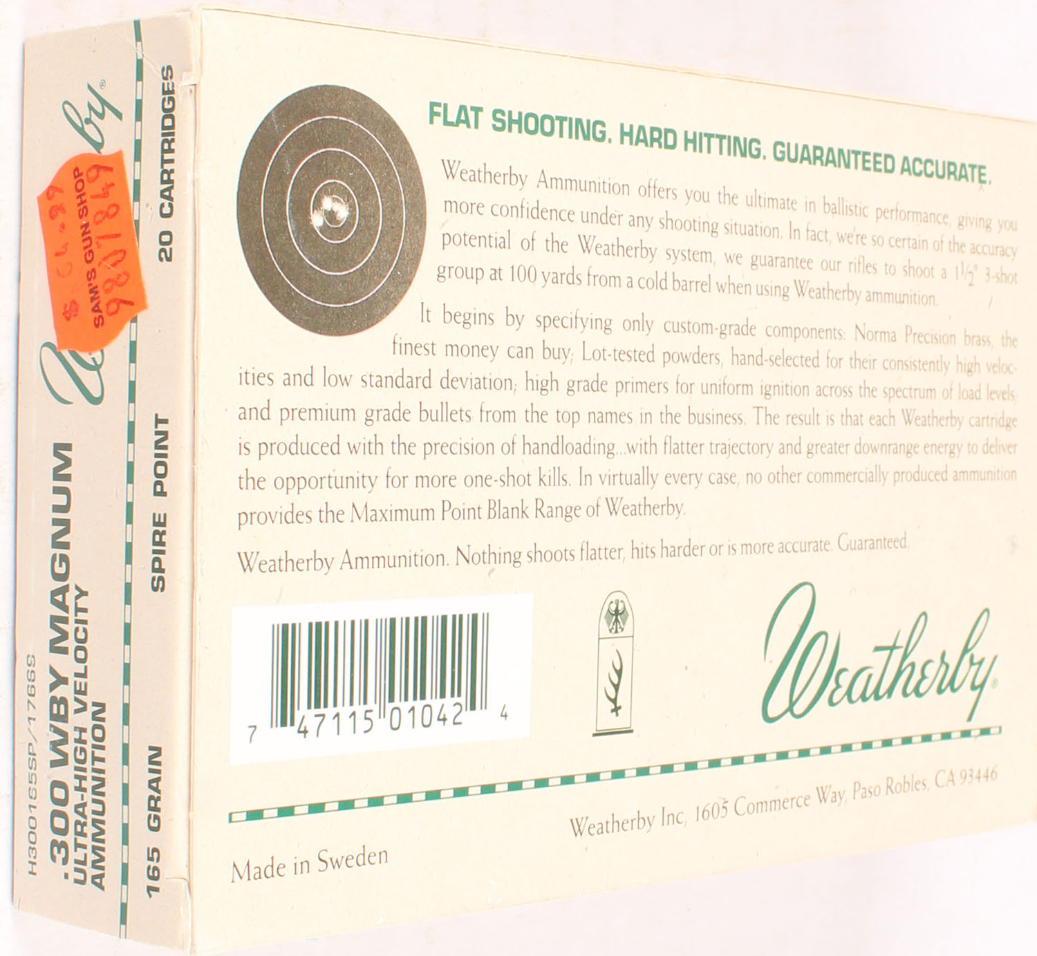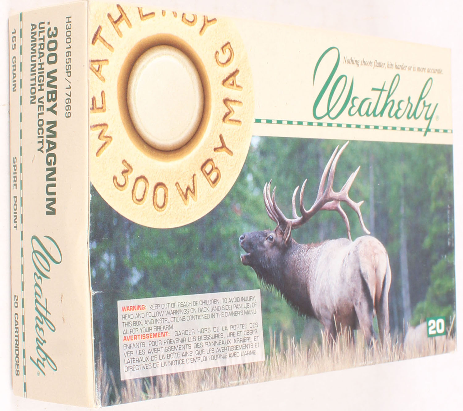 Weatherby, 300 WBY Magnum, 165 Grain Ultra High Velocity Spire Point, Full, 1pc., multi-colored box, box has great color, ammo is excellent. Grade: Excellent - Value: 20 to 80