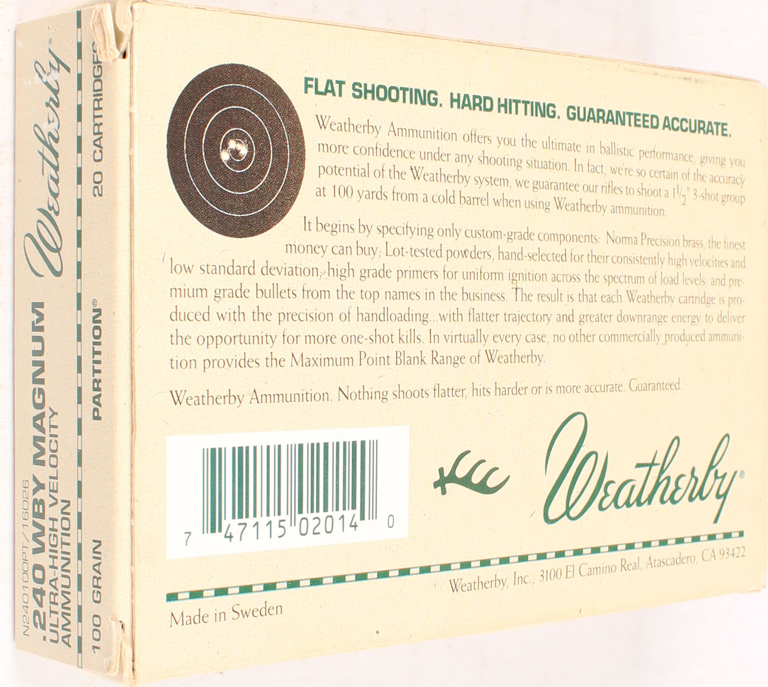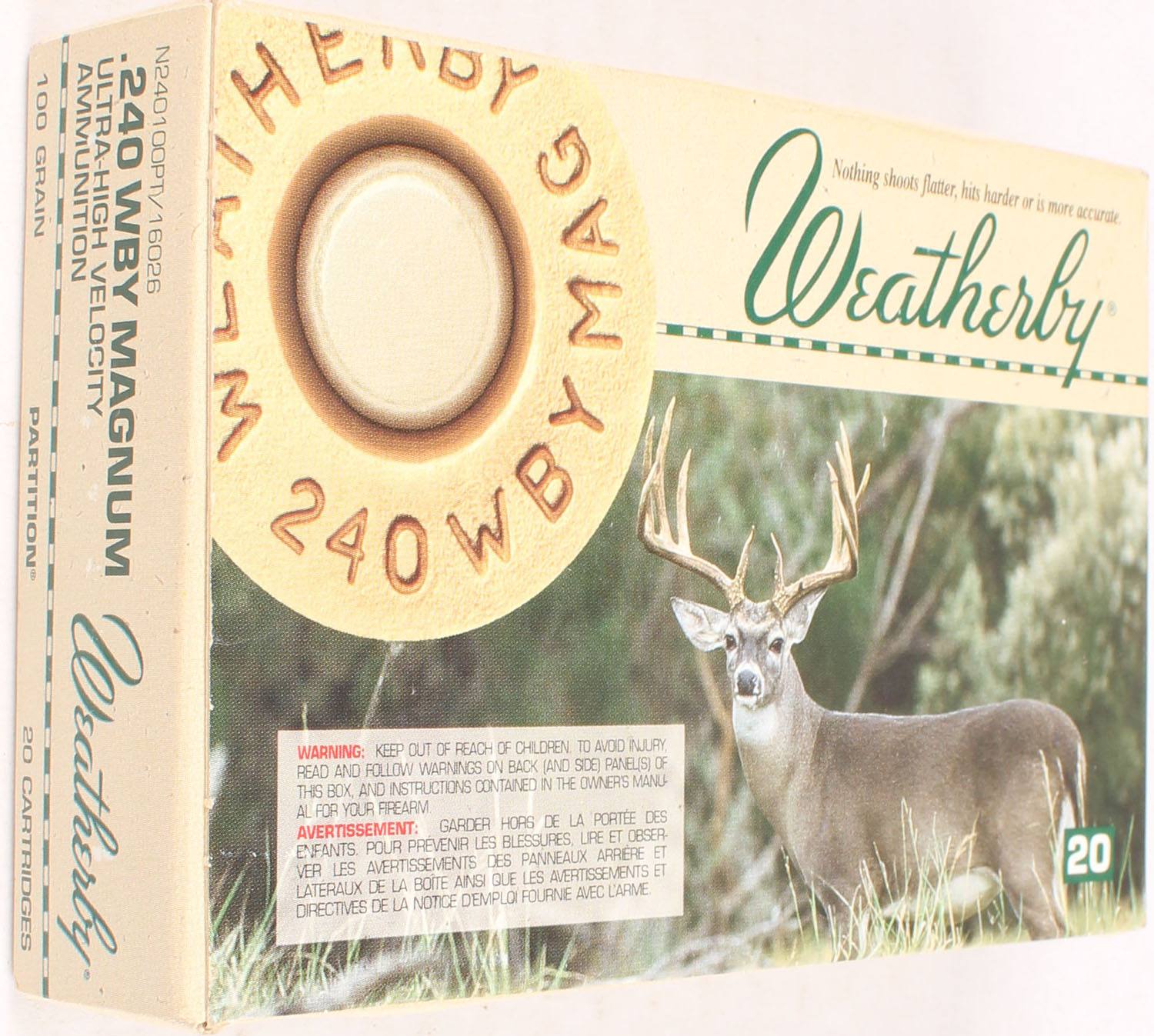 Weatherby, 240 WBY Magnum, 100 Grain Ultra High Velocity Partition, Full, 1pc., multi-colored box, box has great color, ammo is excellent. Grade: Excellent - Value: 20 to 80