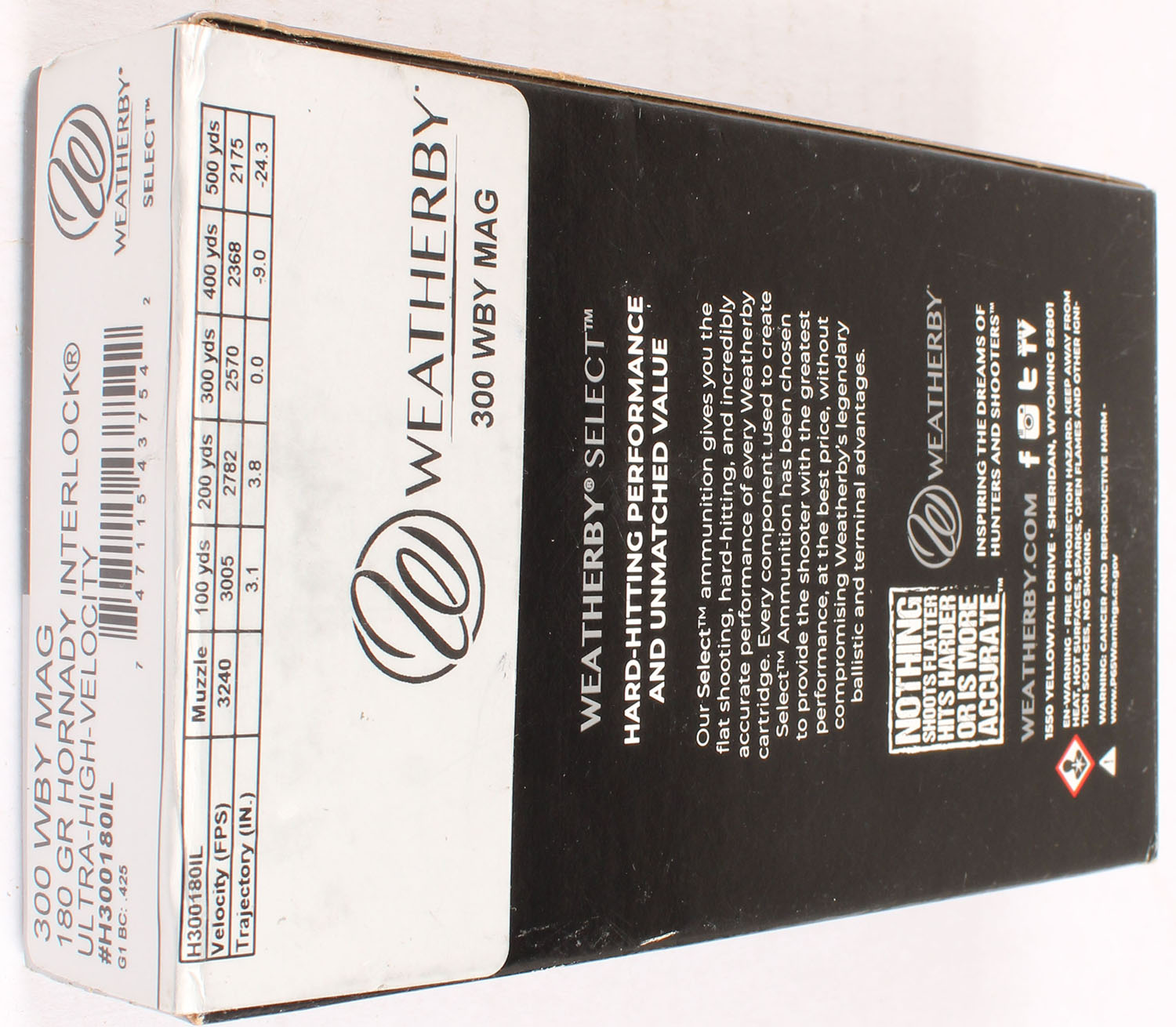 Weatherby, Select Plus, 300 WBY Mag, 180 Grain Hornady Interlock Ultra High Velocity, Full, 1pc., multi-colored box, box has great color, light corner wear, ammo is excellent. Grade: Excellent - Value: 20 to 80