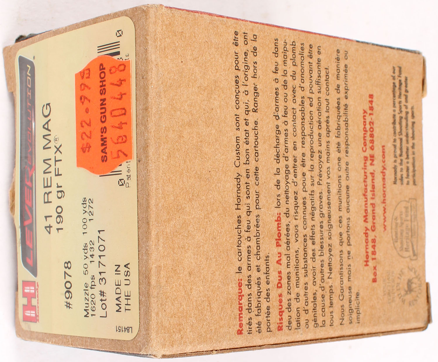 Hornady, Lever Evolution, 41 Rem Mag, 190 Grain FTX, Full, 1pc., multi-colored box, box has great color, ammo is excellent. Grade: Excellent - Value: 10 to 60