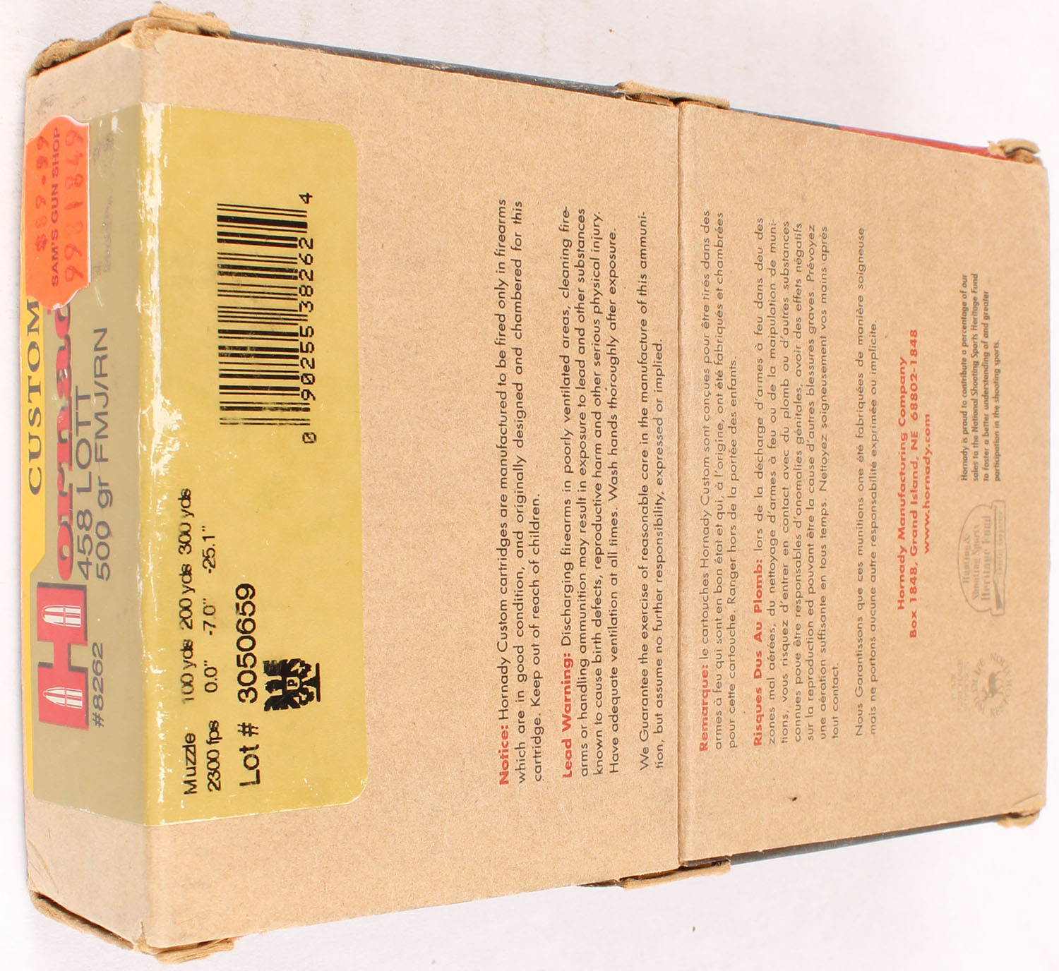 Hornady, .458 LOTT, 500 Grain FMJ-RN, Full, 1pc., multi-colored box, box has great color, ammo is excellent. Grade: Excellent - Value: 40 to 100