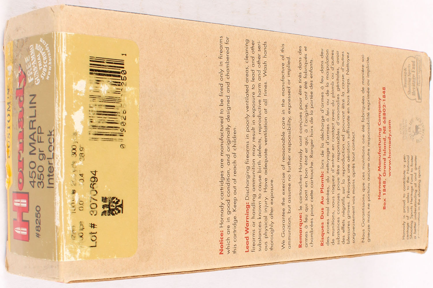 Hornady, Custom, 450 Marlin, 350 Grain FP InterLock, Full, 1pc. multi-colored box, box is solid with excellent color, Ammo is excellent. Grade: Excellent + - Value: 50 to 100