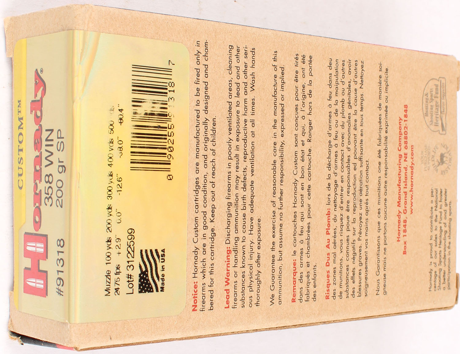 Hornady, Custom, .358 WIN., 200 Grain SP, Full, 1pc. multi-colored box, box is solid with excellent color, Ammo is excellent. Grade: Excellent + - Value: 20 to 60