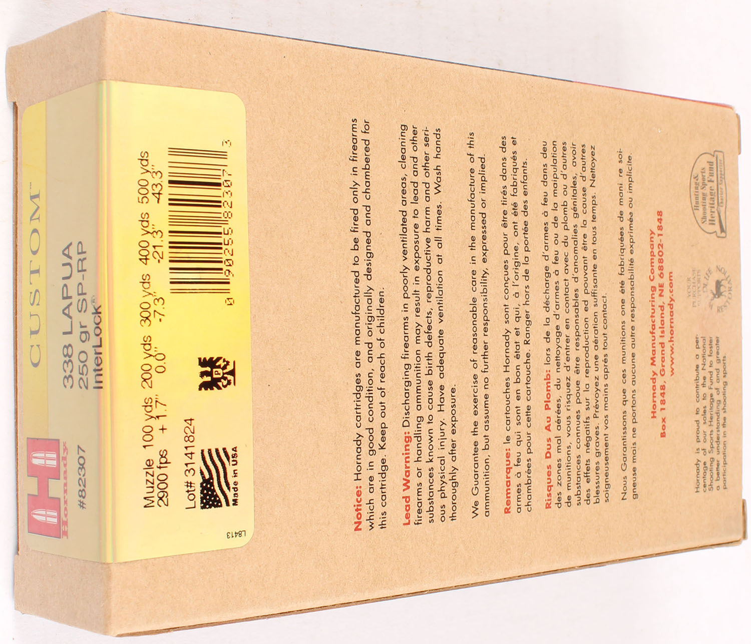 Hornady, Custom, .338 Lapua, 250 Grain SP-RP interlock, Full, 1pc. multi-colored box, box is solid with excellent color, Ammo is excellent. Grade: Excellent ++ - Value: 30 to 90