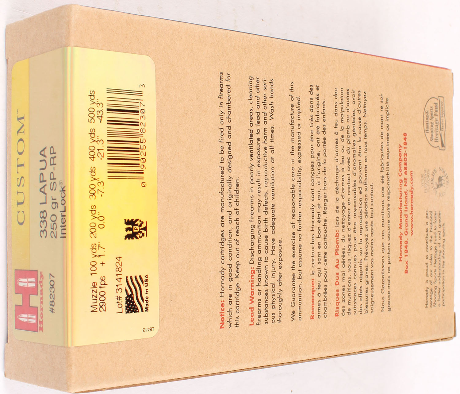 Hornady, Custom, .338 Lapua, 250 Grain SP-RP interlock, Full, 1pc. multi-colored box, box is solid with excellent color, Ammo is excellent. Grade: Excellent ++ - Value: 30 to 90