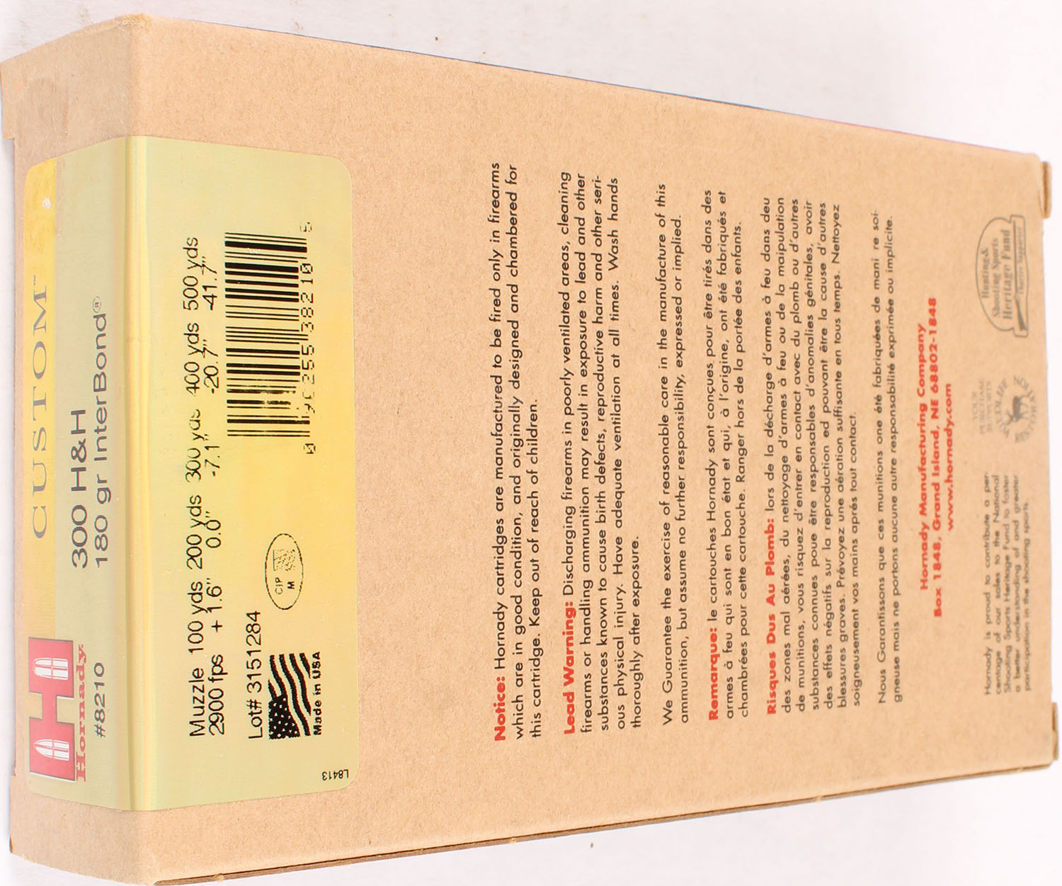 Hornady, Custom, .300 H&H, 180 Grain interBond, Full, 1pc. multi-colored box, box is solid with excellent color, Ammo is excellent. Grade: Excellent - Value: 20 to 60