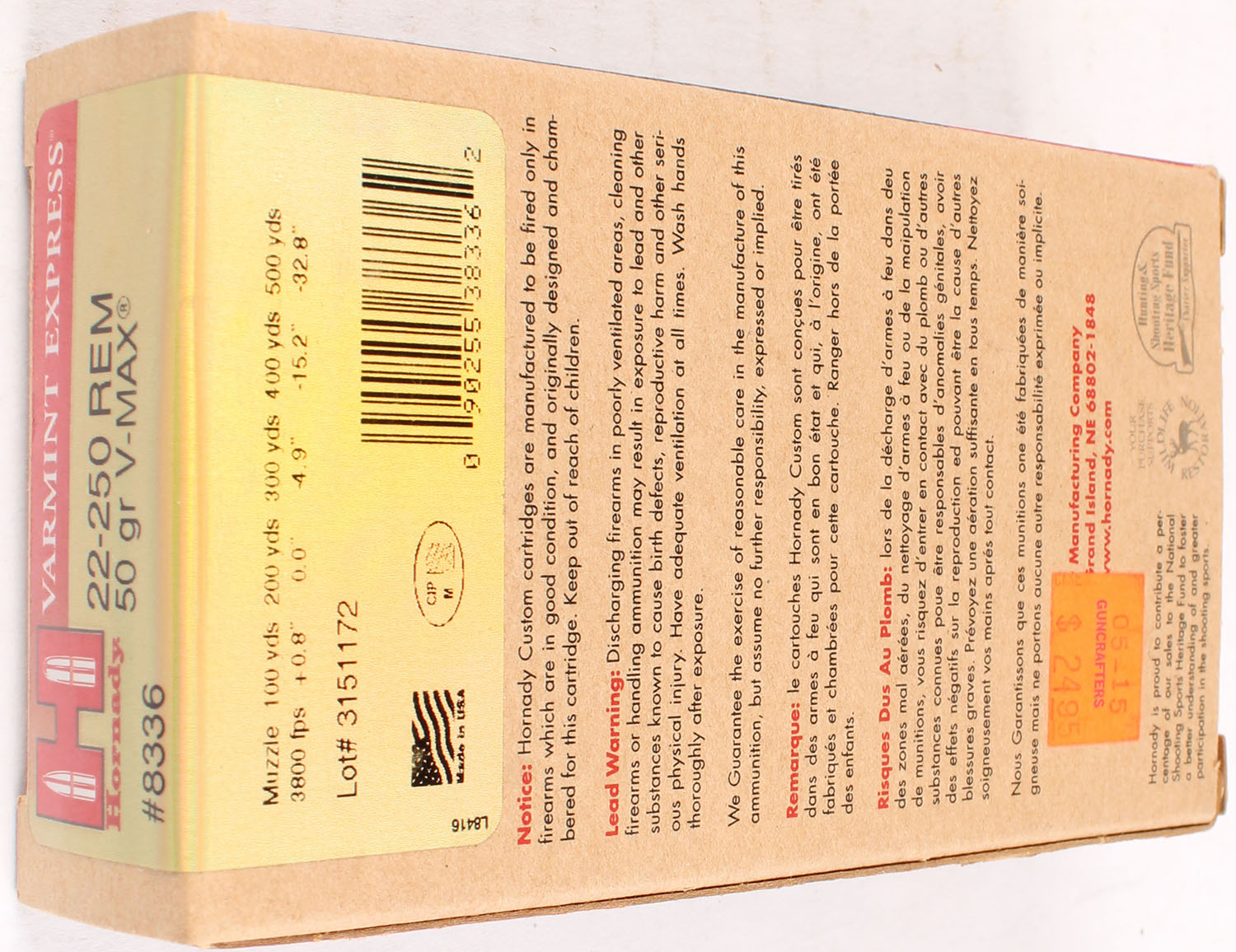 Hornady, Varmint Express, 22-250 REM., 50 Grain V-max, Full, 1pc. multi-colored box, box is solid with excellent color, Ammo is excellent. Grade: Excellent ++ - Value: 20 to 60