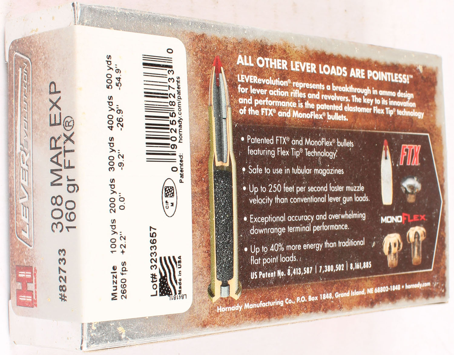 Hornady, LeverEvolution, .308 Mar EXP, 160 Grain FTX, Full, 1pc. multi-colored box, box is solid with excellent color, Ammo is excellent. Grade: Excellent ++ - Value: 40 to 80