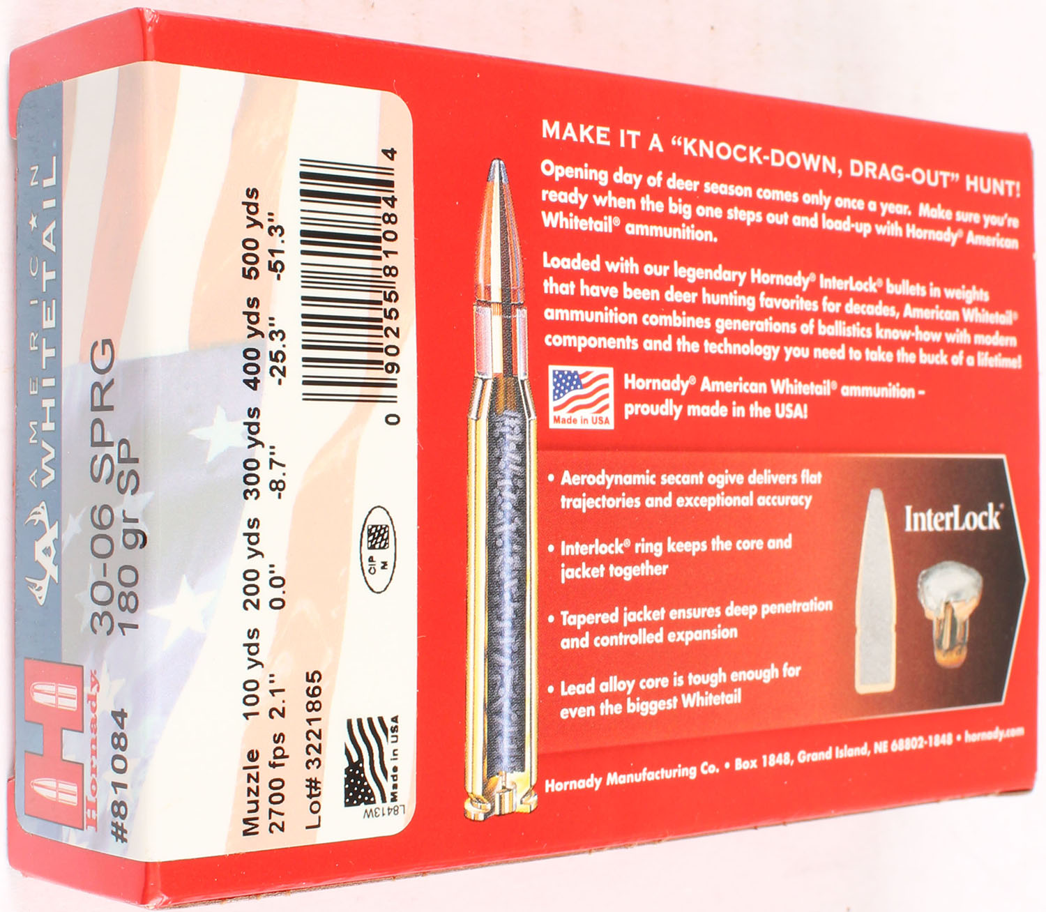 Hornady, American Whitetail, 30-06 SPRG, 180 Grain SP, Full, 1pc. multi-colored box, box is solid with excellent color, Ammo is excellent. Grade: Excellent ++ - Value: 16 to 40