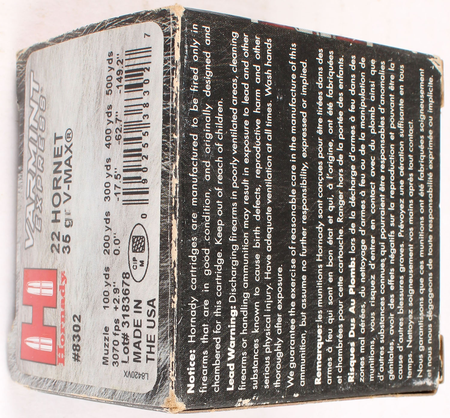 Hornady, Varmint Express, .22 Hornet, 35 Grain V-Max, Full, 1pc. multi-colored box, box is solid with excellent color, Ammo is excellent. Grade: Excellent ++ - Value: 20 to 60