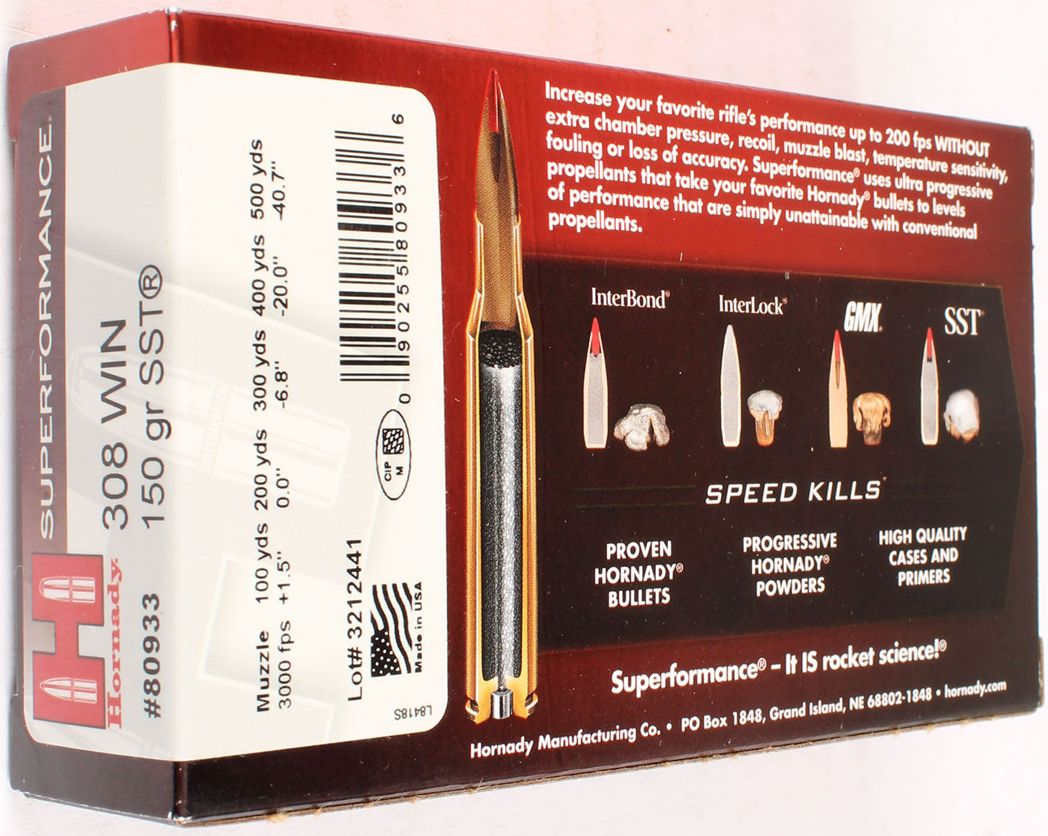 Hornady, Superformance, .308 Win., 150 Grain SST, Full, 1pc. multi-colored box, box is solid with excellent color, Ammo is excellent. Grade: Excellent ++ - Value: 30 to 90