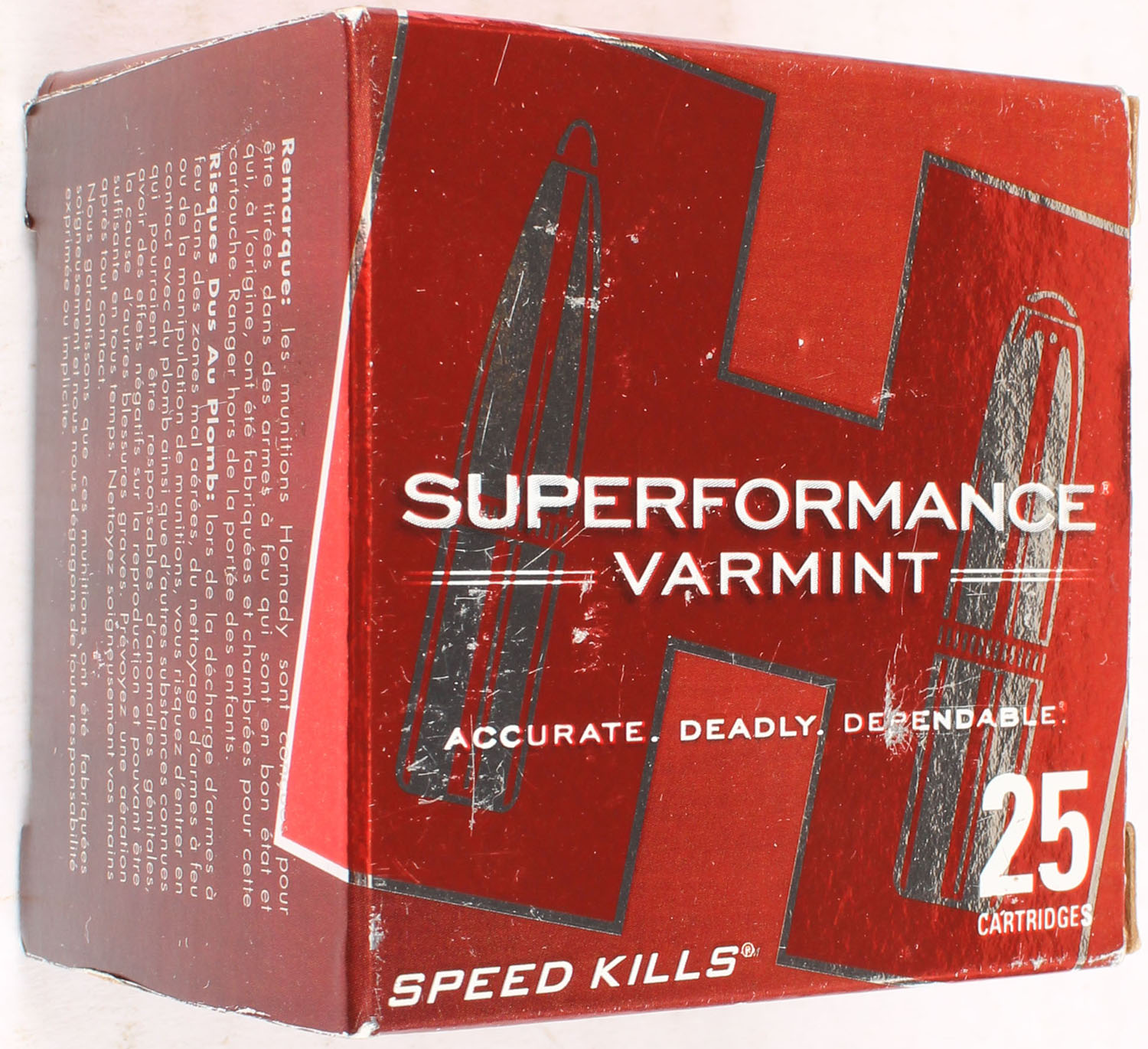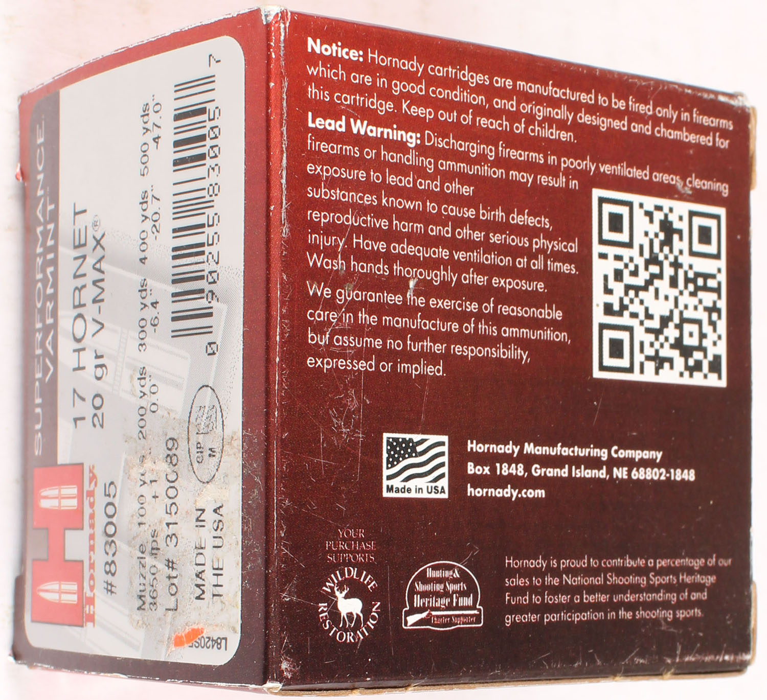 Hornady, Superformance, .17 Hornet, 20 Grain V-Max, Full, 1pc. multi-colored box, box is solid with excellent color, Ammo is excellent. Grade: Excellent ++ - Value: 16 to 50
