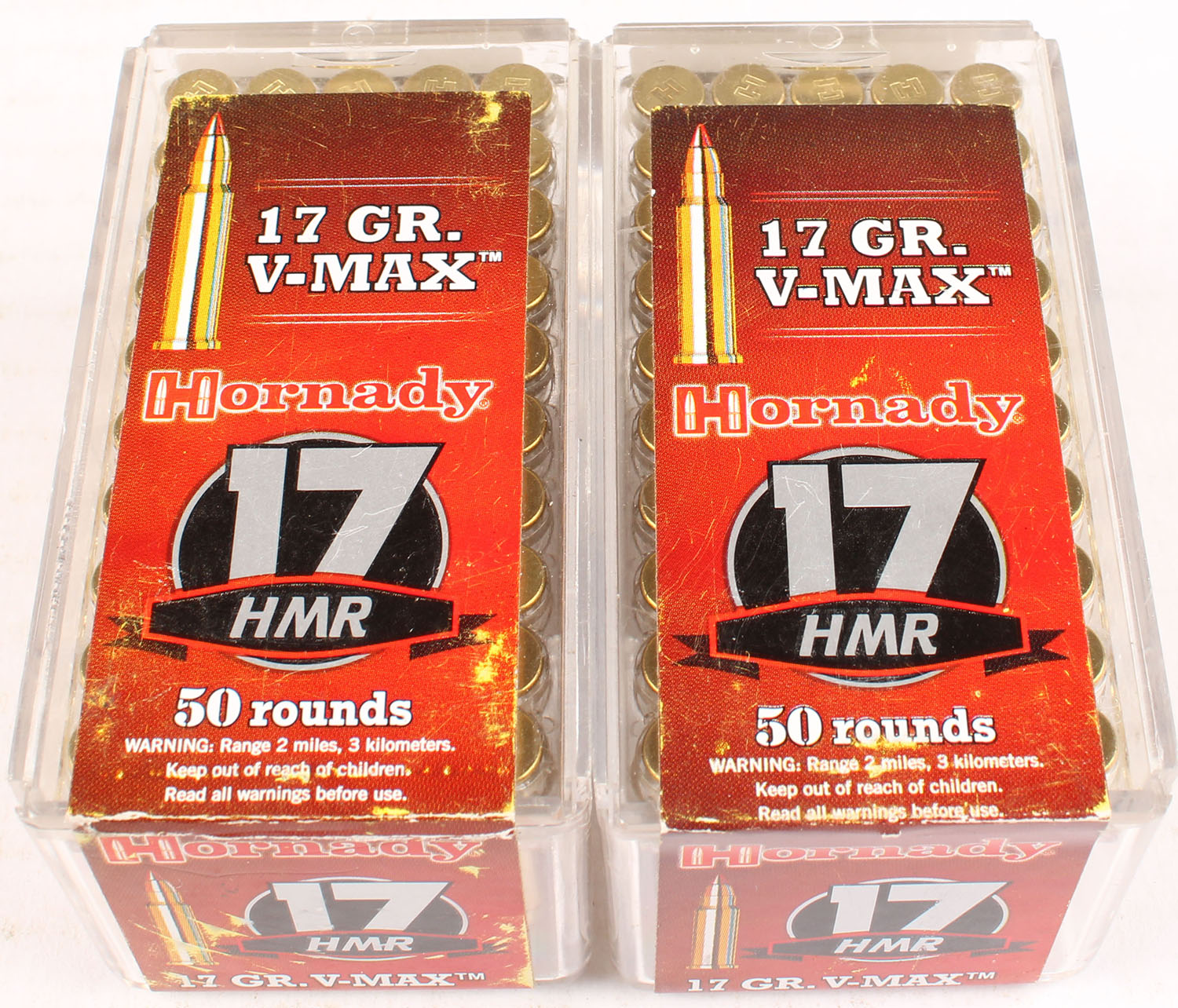 Lot of 2 Hornady, 17 HMR, 17 Grain V-Max, FULL & SEALED, 50 rds each or 100 total rounds. 1pc. Multi-colored boxes, boxes are solid with excellent color, Ammo is excellent. Grade: Excellent - Value: 10 to 40