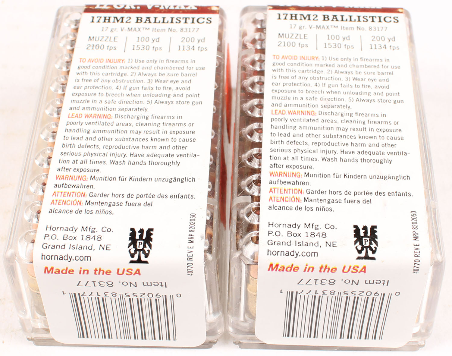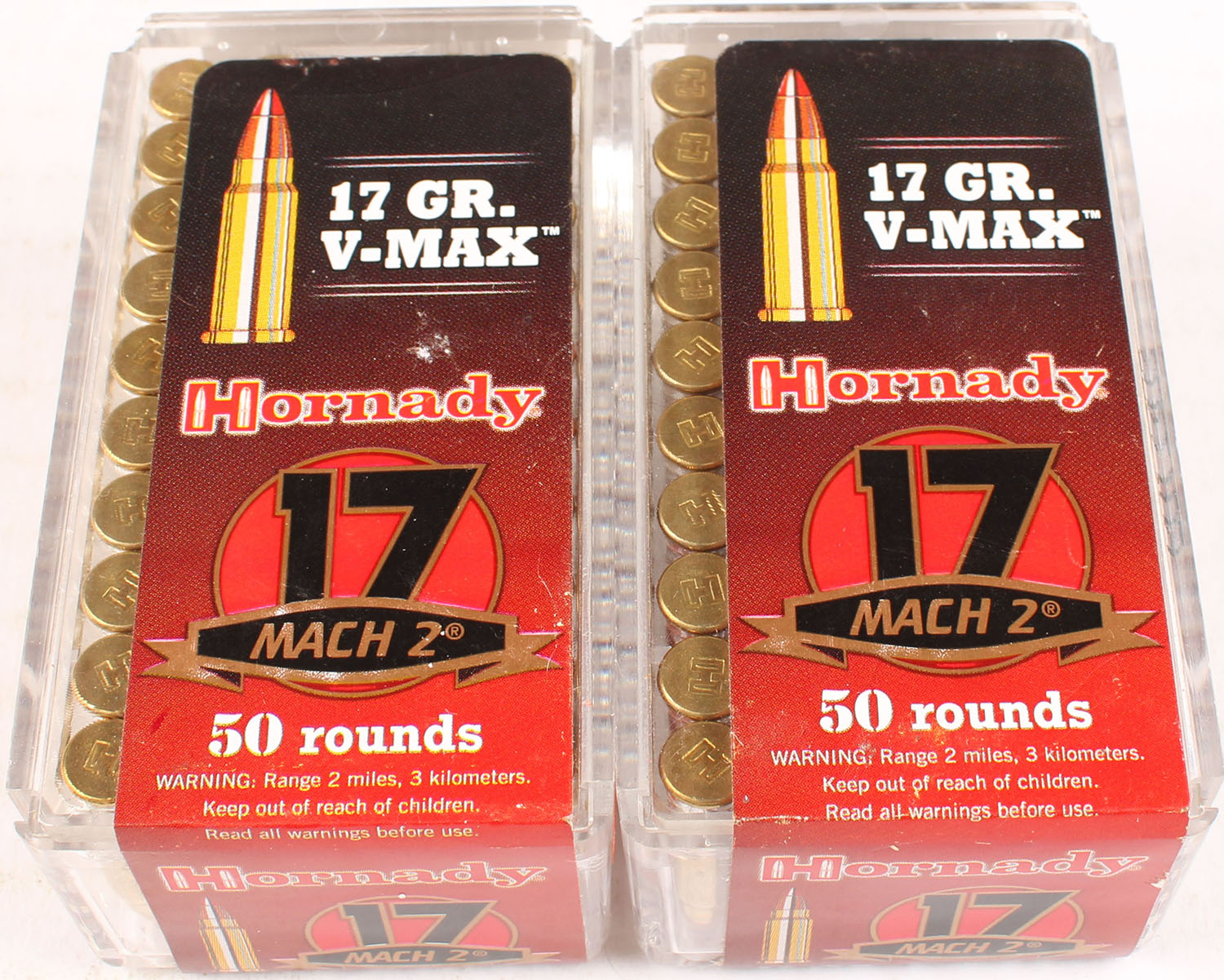 Lot of 2 Hornady, 17 HMR, MACH 2, 17 Grain V-Max, FULL & SEALED, 50 rds each or 100 total rounds. 1pc. Multi-colored boxes, boxes are solid with excellent color, Ammo is excellent. Grade: Excellent ++ - Value: 10 to 40