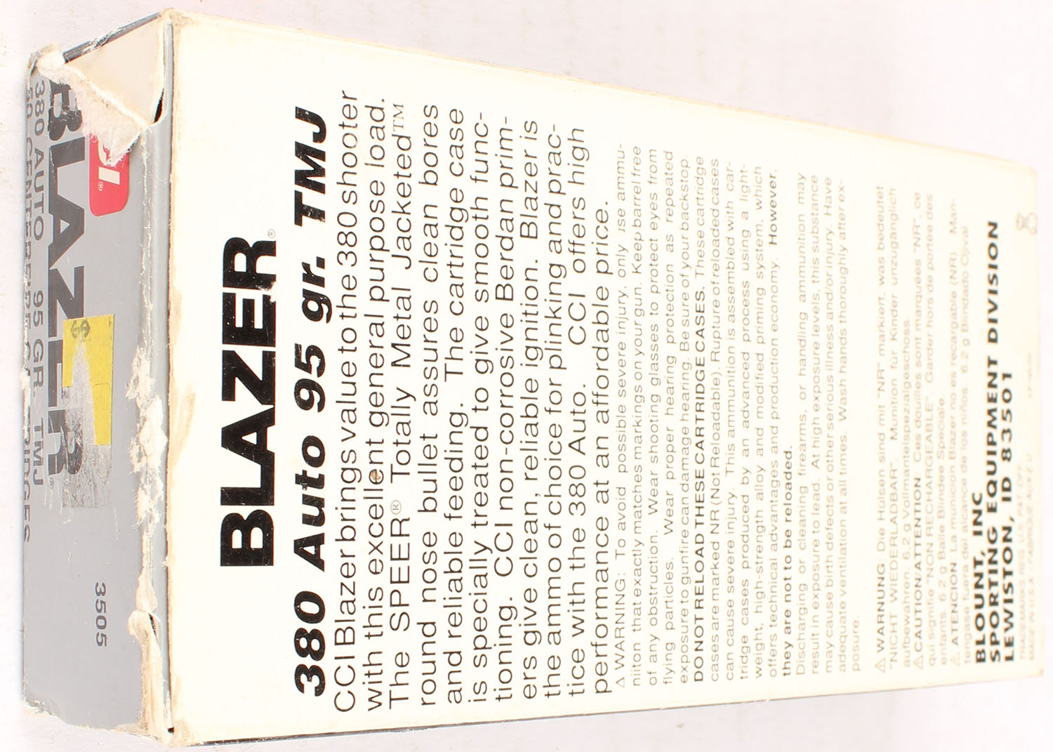 CCI, Blazer, 380 Auto, 95 Grain TMJ, Full, 1pc. multi-colored box, box is solid with excellent color, Ammo is excellent. Grade: Excellent ++ - Value: 16 to 50