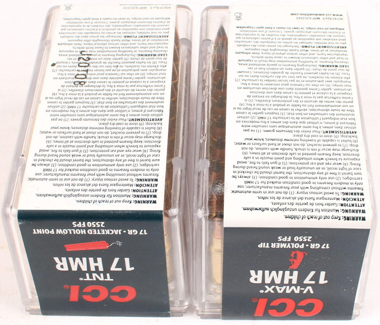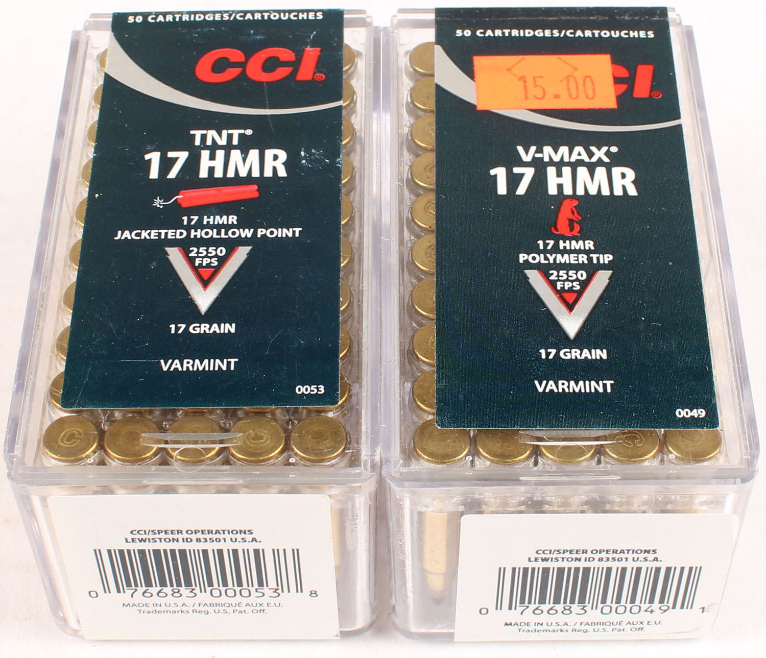 Lot of 2 CCI, 17 HMR HP, FULL & SEALED, 50 rds each or 100 total rounds. 1pc. Multi-colored boxes, boxes are solid with excellent color, Ammo is excellent. Grade: Excellent ++ - Value: 10 to 50