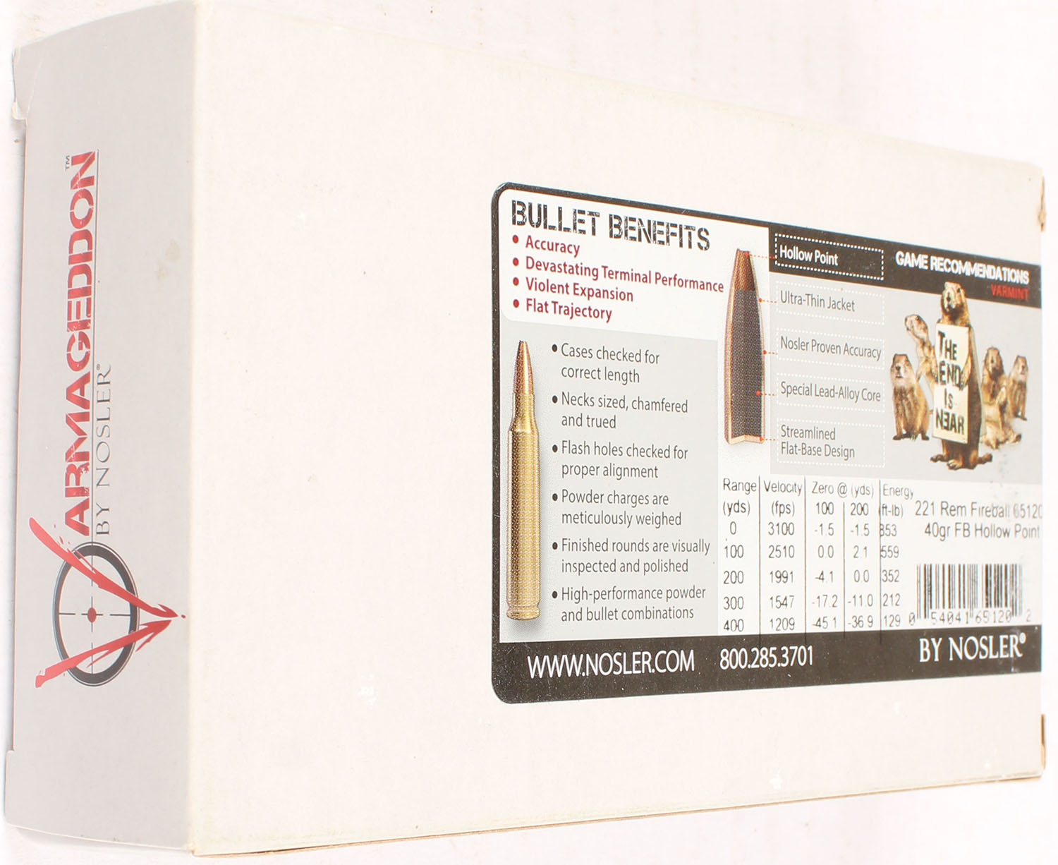 Nosler Armageddon, .221 Rem Fireball, 40 Grain FB HP, Full, 1pc. multi-colored box, box is solid, Ammo is excellent. Grade: Excellent ++ - Value: 16 to 50