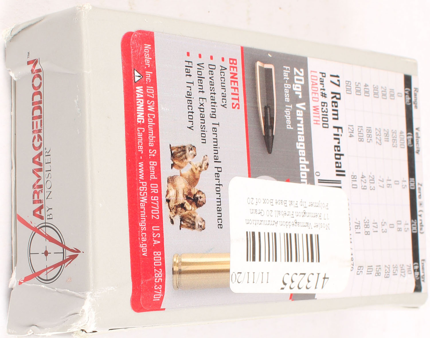 Nosler Armageddon, .17 Rem Fireball, 20 Grain FB tipped, Full, 1pc. multi-colored box, box is solid, Ammo is excellent. Grade: Excellent ++ - Value: 16 to 50