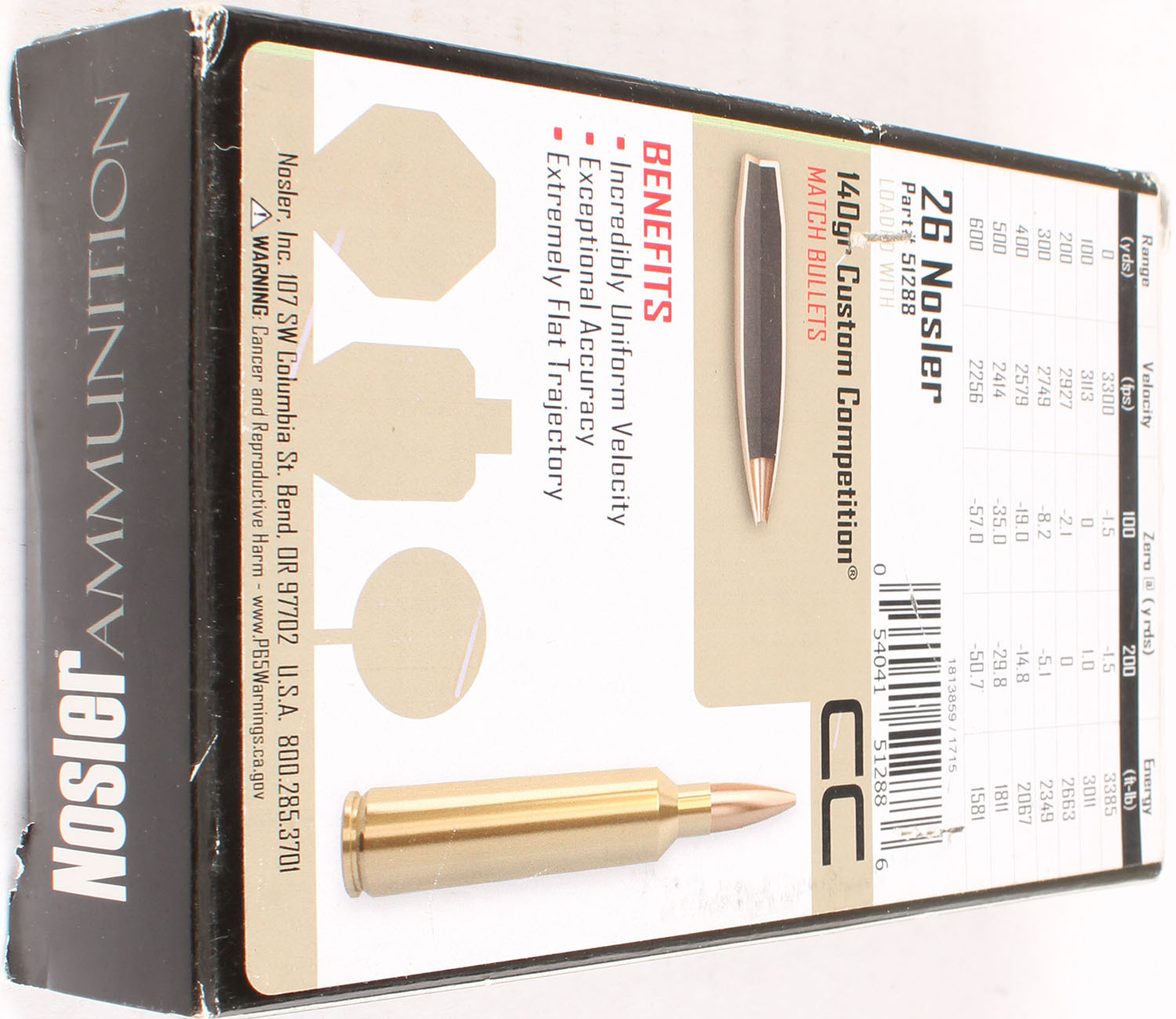 Nosler, MATCH Grade, 26 Nosler, 140 Grain, Full, 1pc. multi-colored box, box is solid with excellent color, Ammo is excellent. Grade: Excellent ++ - Value: 20 to 80