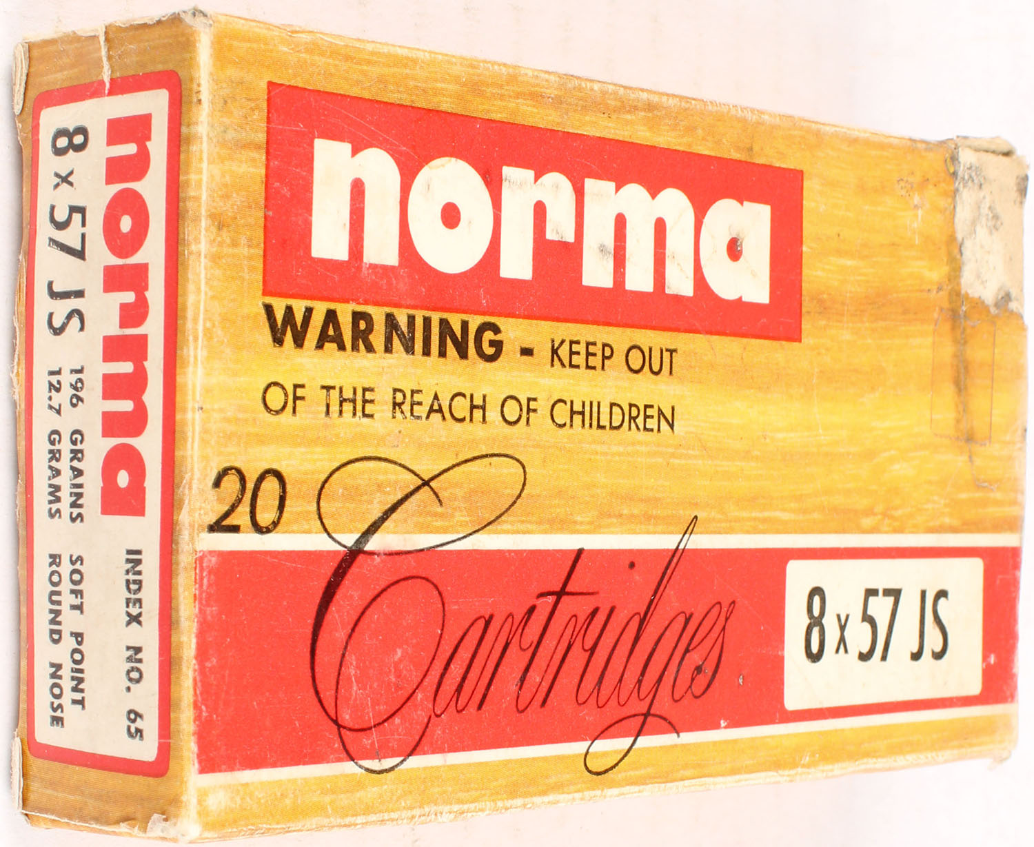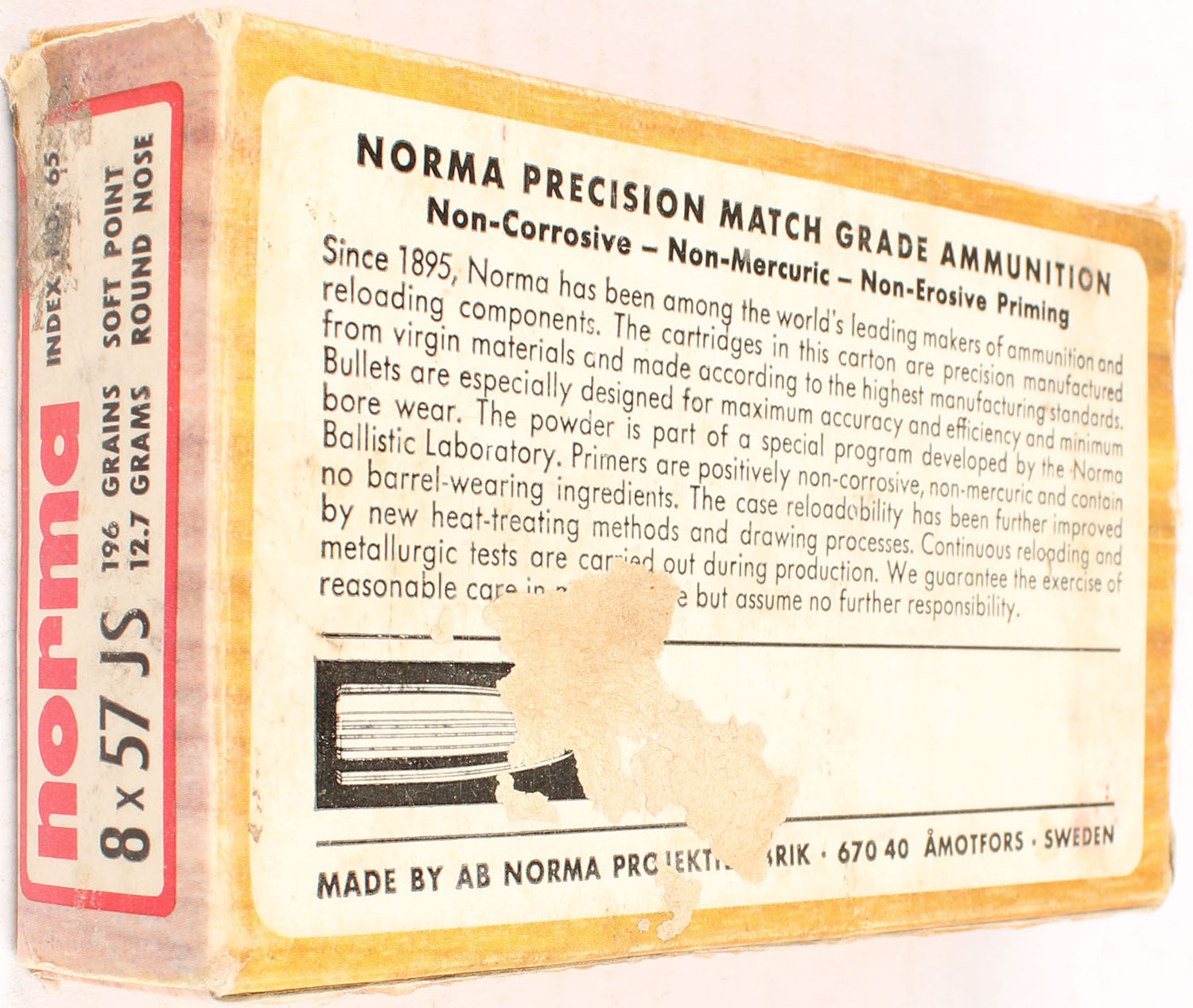 Norma, 8 x 57 JS., 196 Grains SP, Full, 1pc. multi-colored box, box is solid with age soiling, Ammo is excellent. Grade: Very Good ++ - Value: 16 to 50