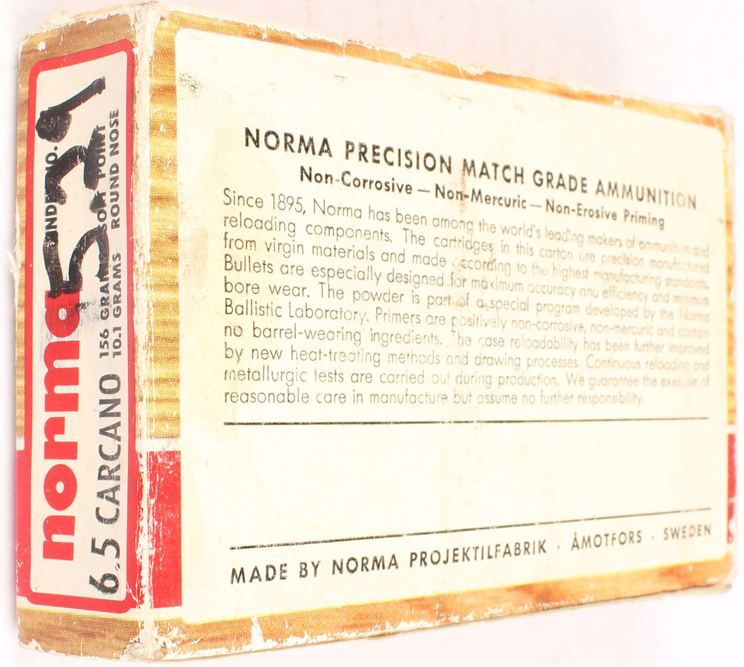 Norma, 6.5 Carcano, 156 Grains Soft Point, Full, 1pc. multi-colored box, box has scuffing, Ammo is excellent. Grade: Very Good ++ - Value: 20 to 60
