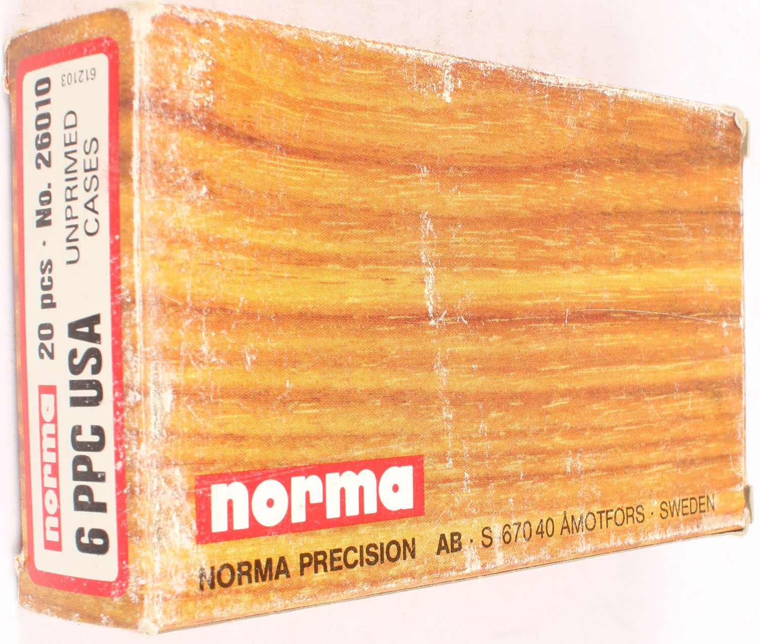 Norma, 6 PPC USA, boxed marked unprimed cases but ammo is primed and loaded, 20 rds., 1pc. multi-colored box, box has scuffing, Ammo is excellent. Grade: Very Good ++ - Value: 6 to 50