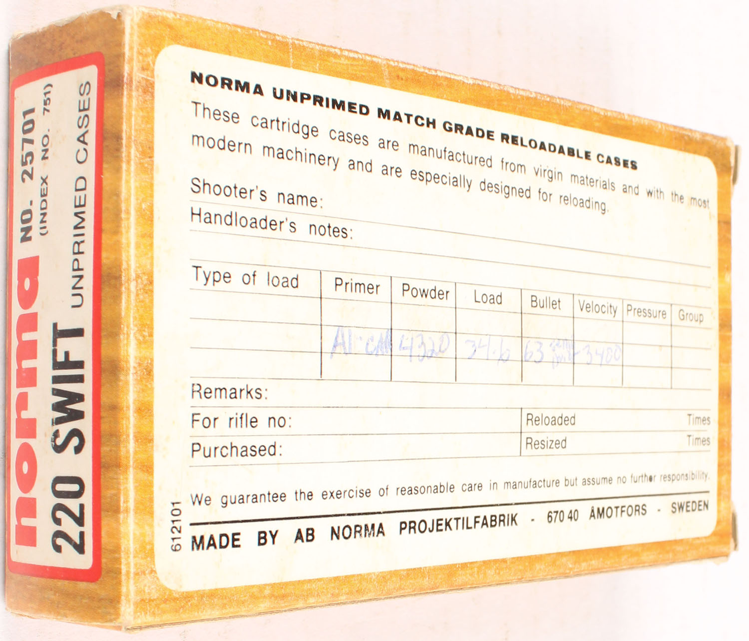 Norma, .220 SWIFT, boxed marked unprimed case but ammo is primed and loaded, 20 rds., 1pc. multi-colored box, box is solid, Ammo is excellent. Grade: Excellent - Value: 10 to 60
