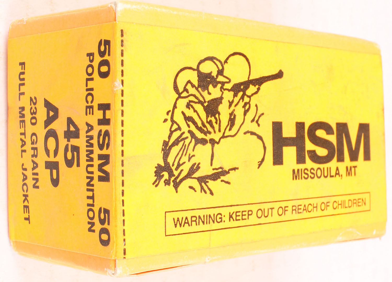 HSM, .45 ACP, 230 Grain FMJ, FULL & SEALED, POLICE AMMUNITION, 1pc., orange and black box, box is solid. Grade: Excellent - Value: 16 to 60