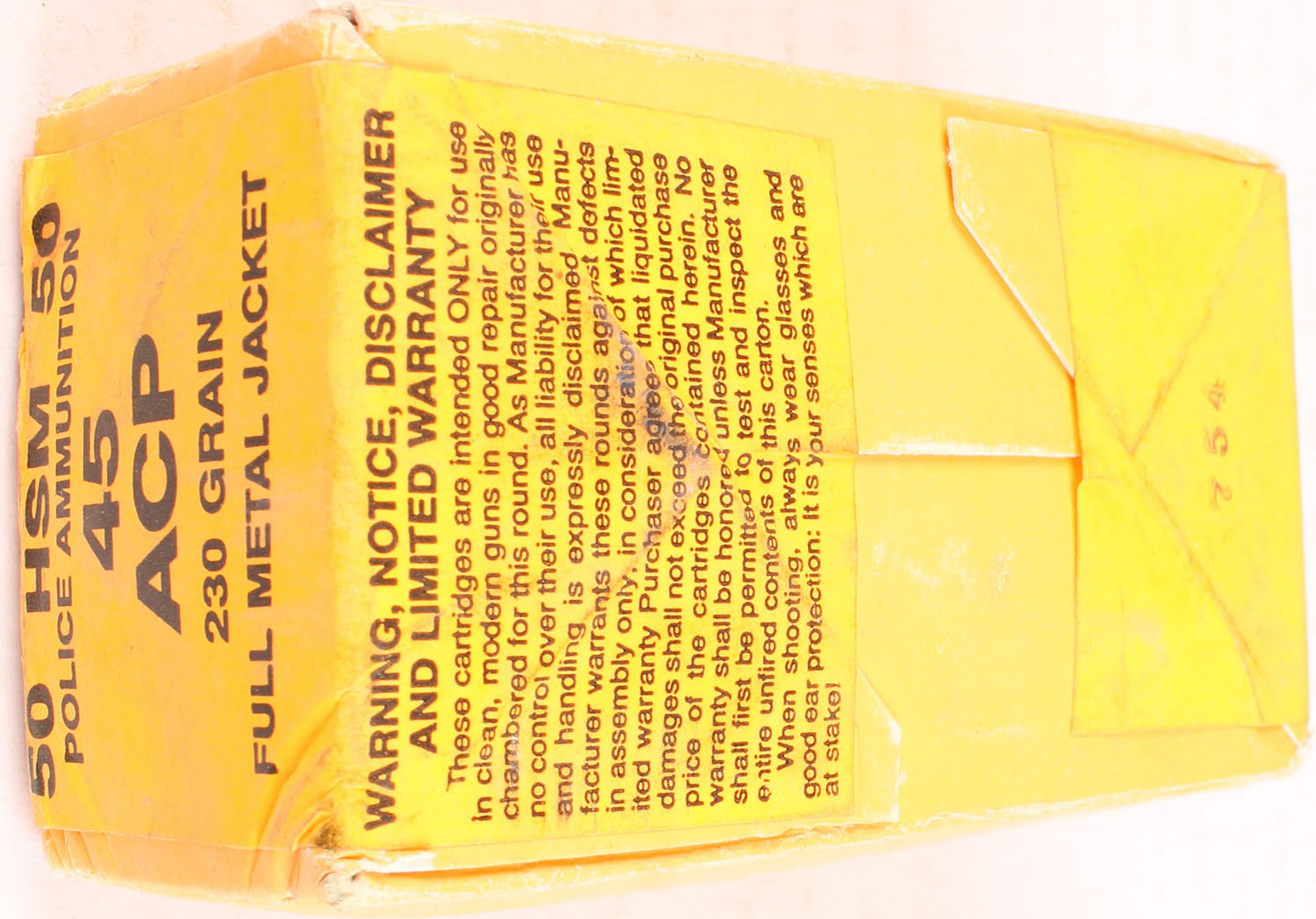 HSM, .45 ACP, 230 Grain FMJ, FULL & SEALED, POLICE AMMUNITION, 1pc., orange and black box, box has scuffing. Grade: Very Good ++ - Value: 16 to 60