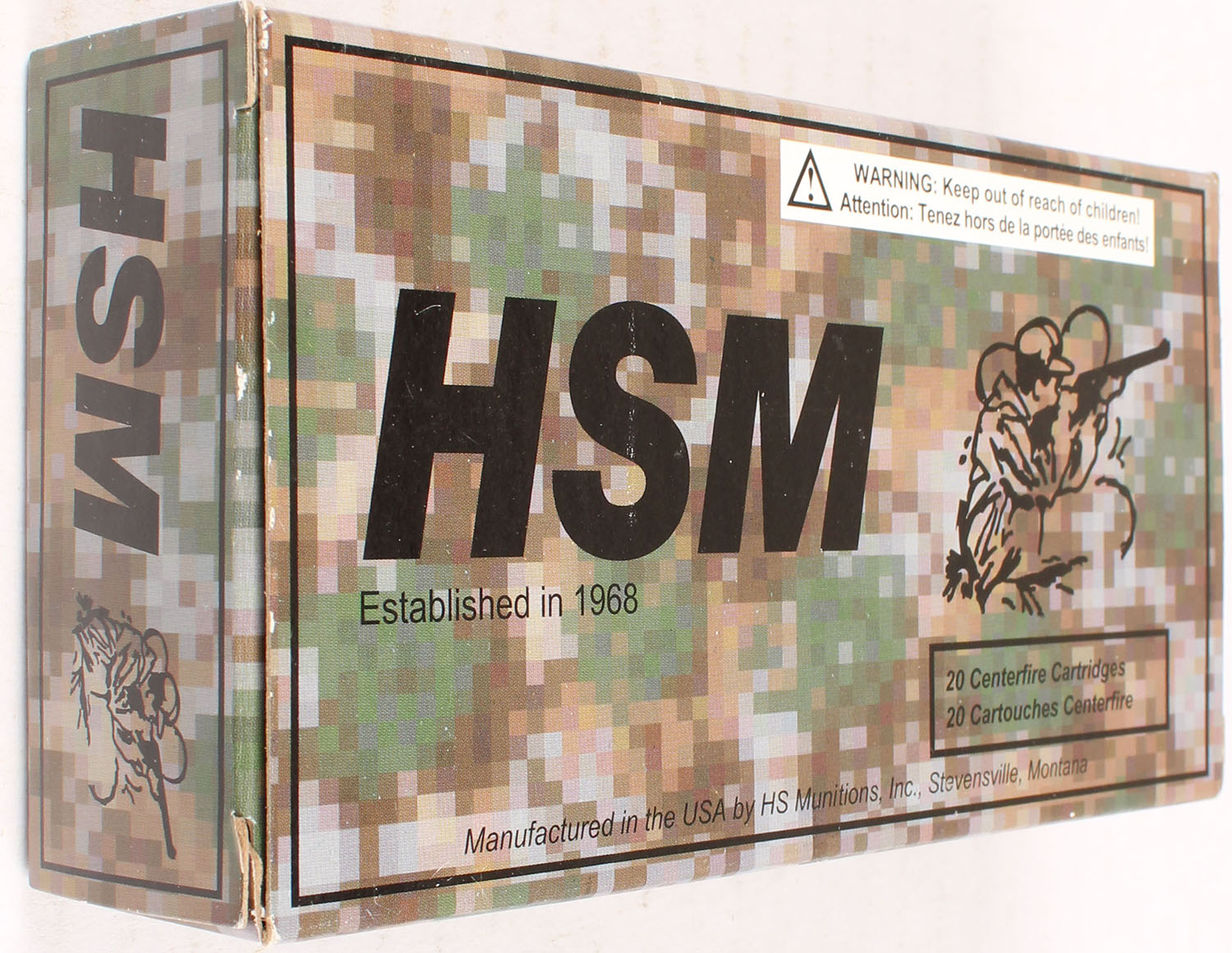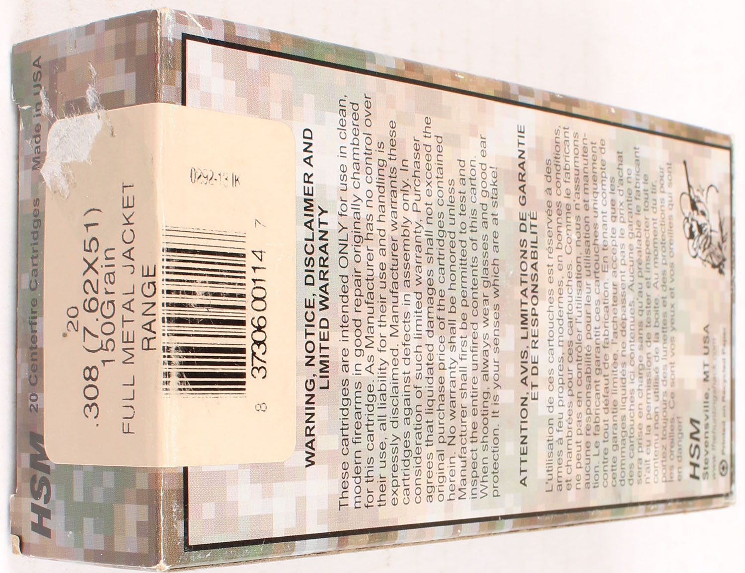 HSM, .308 cal., 150 Grain FMJ RANGE, Full of HP .308 marked Carts., 1pc., multi-colored box, box is solid with excellent color, Ammo is excellent. Grade: Excellent ++ - Value: 16 to 60