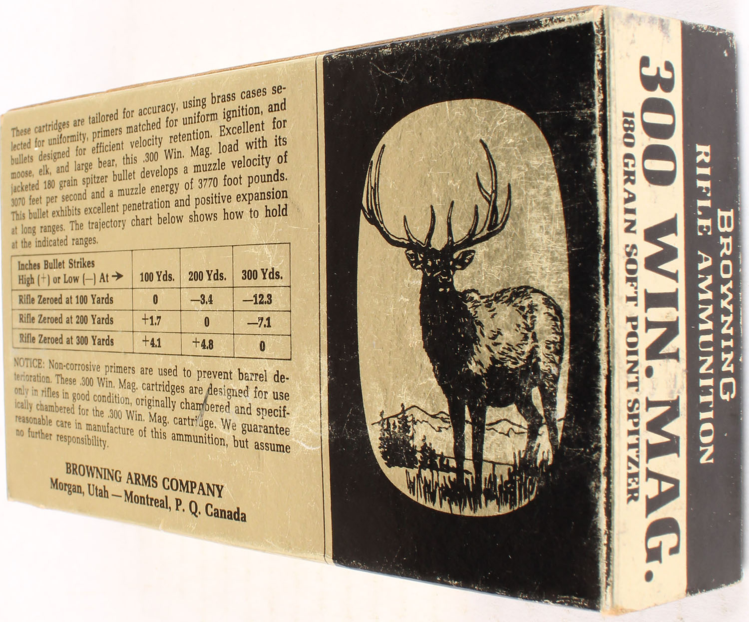 Browning, .300 Win Mag, 180 Grain Soft Point Spitzer, Full, 1pc., multi-colored box, box has scuffing, Ammo is excellent. Grade: Excellent - Value: 50 to 150