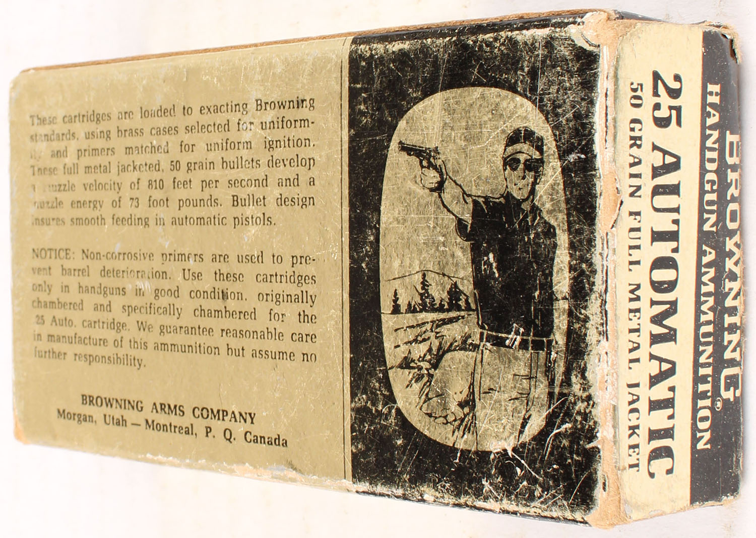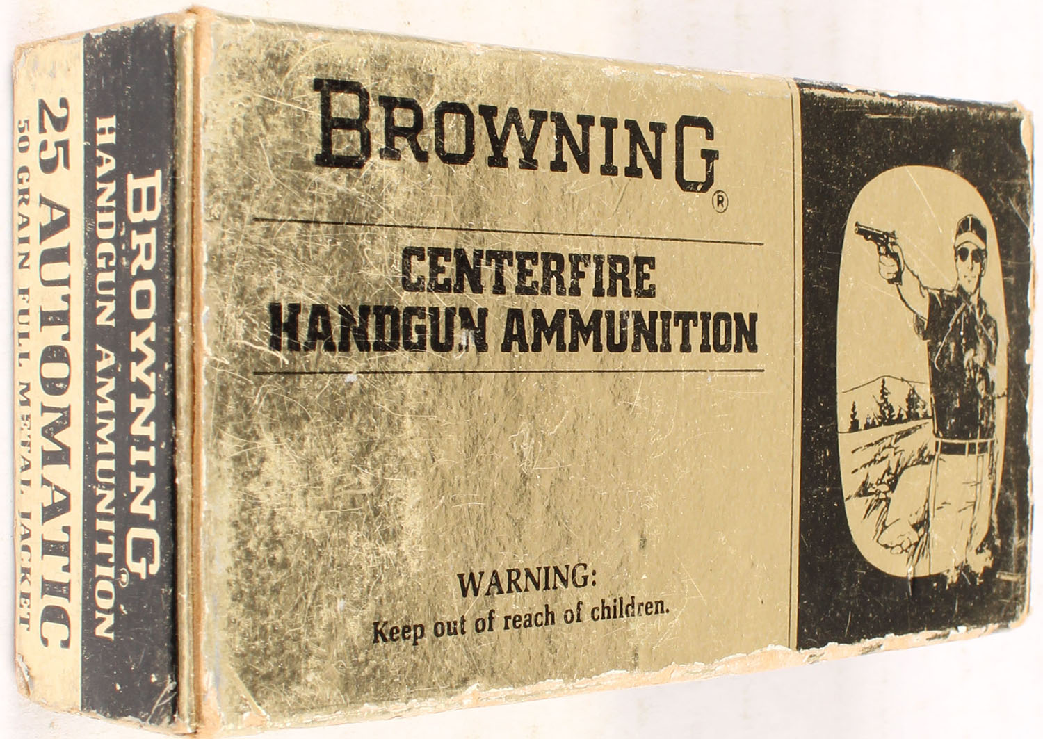 Browning, .25 Auto., 50 Grain FMJ, Full of mixed H/S, 1pc., multi-colored box, box has scuffing and shelf wear, Ammo is excellent. Grade: Very Good - Value: 20 to 80