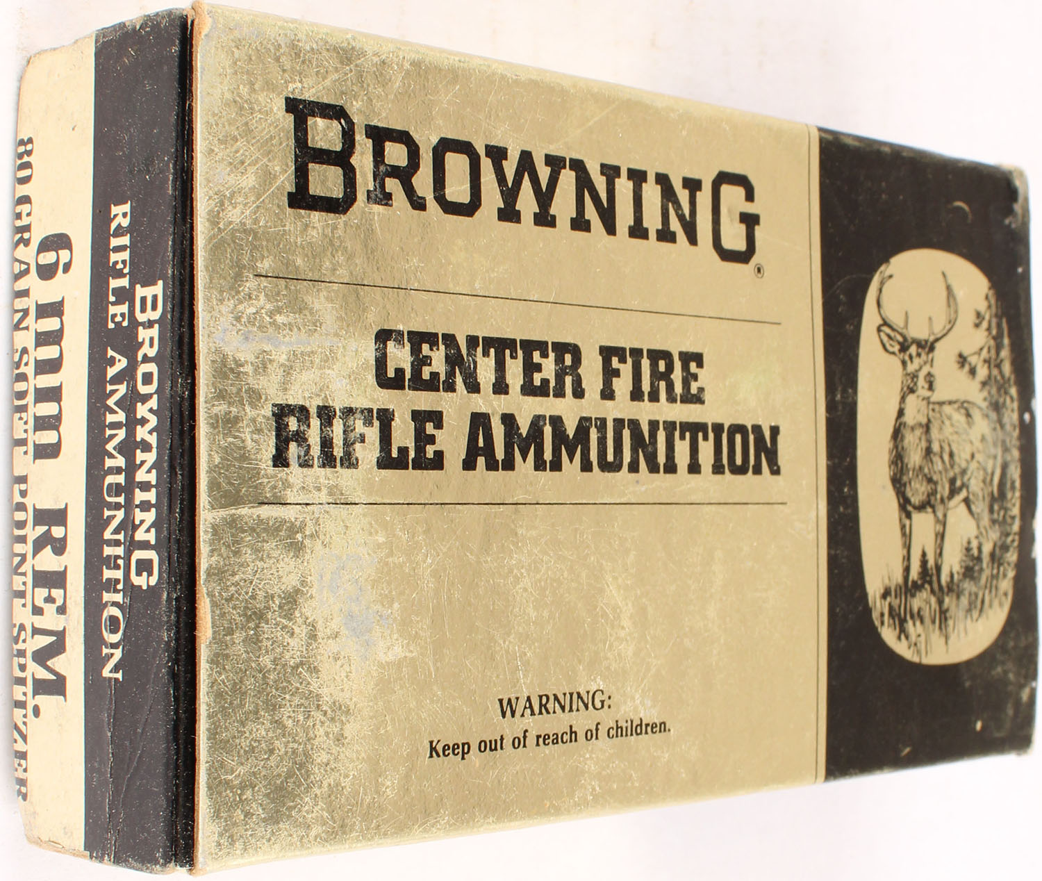 Browning, 6 mm Rem., 80 Grain Soft Point Spitzer, Full, 1pc., multi-colored box, box has scuffing with shelf wear, Ammo is only good and has soiling. Grade: Very Good - Value: 20 to 100