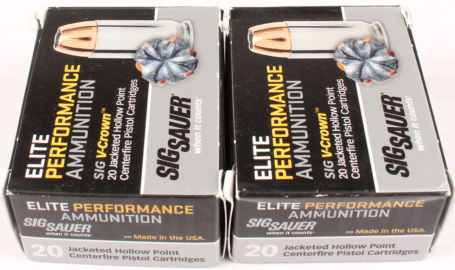 Lot of 2 Sig Sauer, Elite Performance, 9mm luger, 115 Grain V-Crown JHP, Full, 1pc. multi-colored box, box is solid, Ammo is excellent. Grade: Excellent ++ - Value: 16 to 60