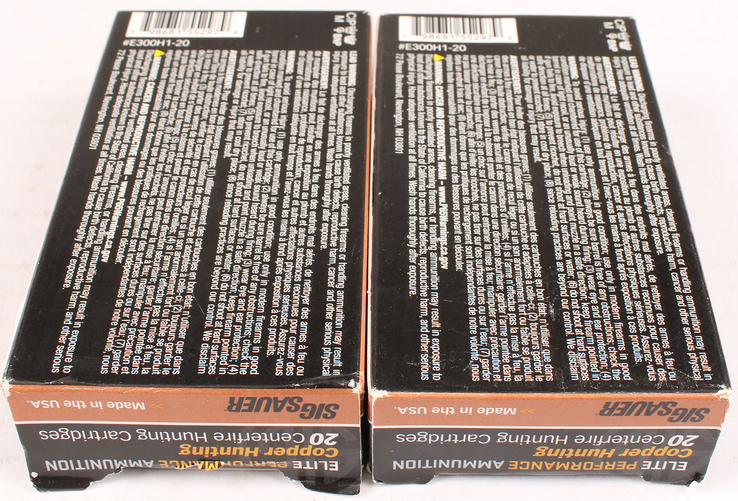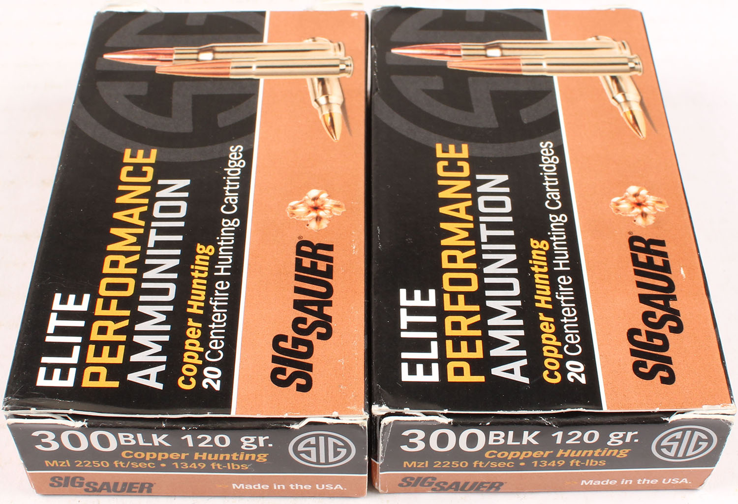 Lot of 2 Sig Sauer, Elite Performance, .300 BLK., 120 Grain Copper Hunting, Full, 1pc. multi-colored box, box is solid, Ammo is excellent. Grade: Excellent ++ - Value: 10 to 50