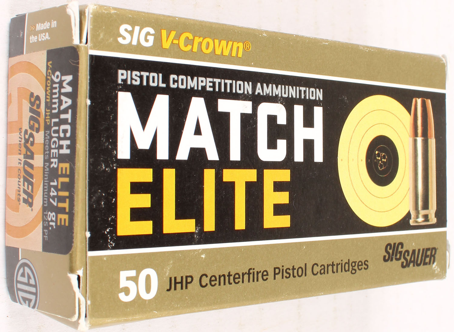 Sig Sauer, Match Elite, 9mm Luger., 147 Grain V-Crown JHP, Full, 1pc. multi-colored box, box has edge wear, Ammo is excellent. Grade: Excellent - Value: 16 to 60