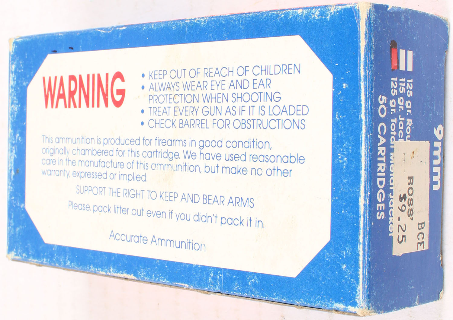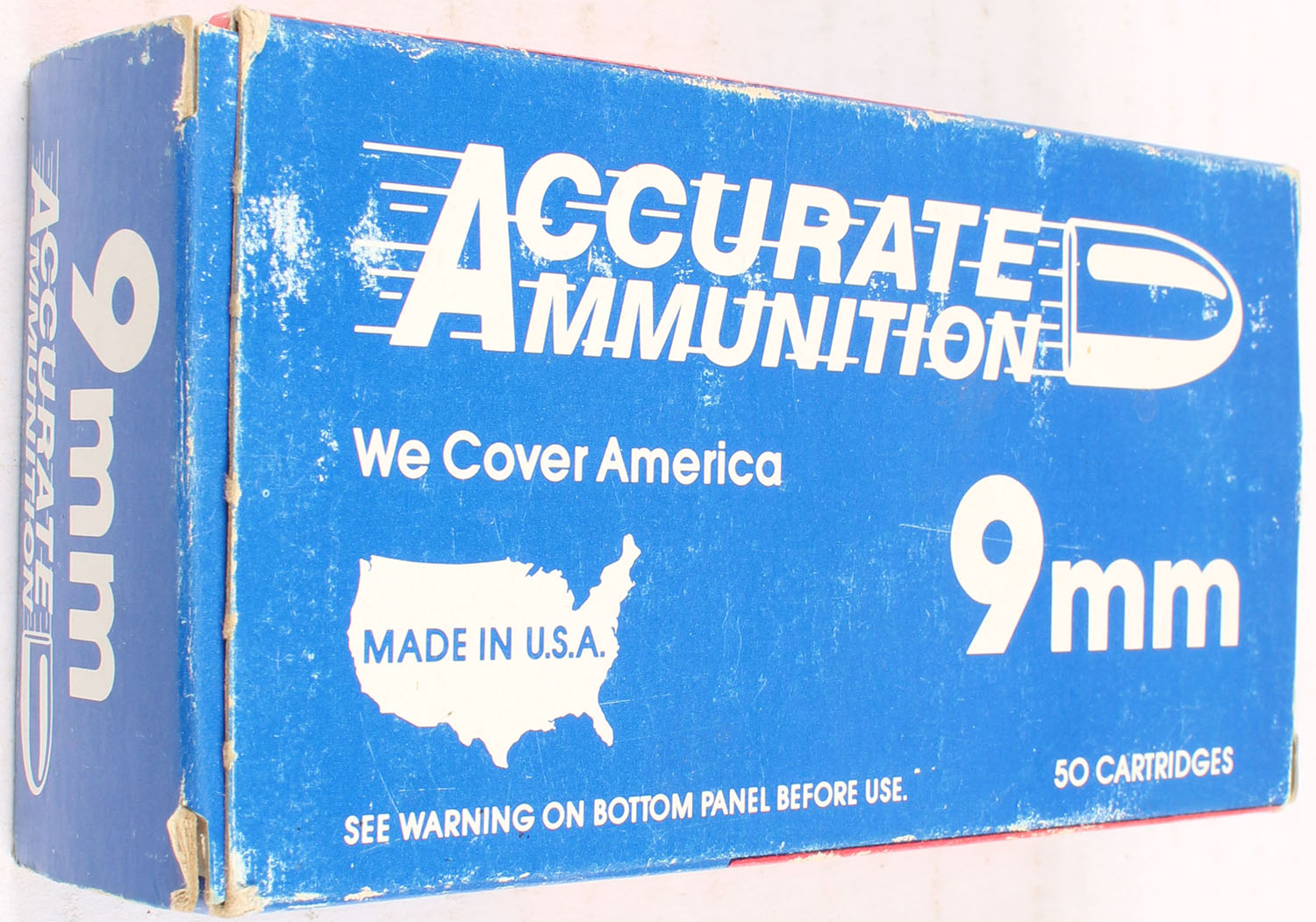 Accurate Ammo 9mm 125 gr. TMJ, FULL, 1pc. multi-colored box, box has scuffing, Ammo is excellent. Grade: Very Good ++ - Value: 10 to 50