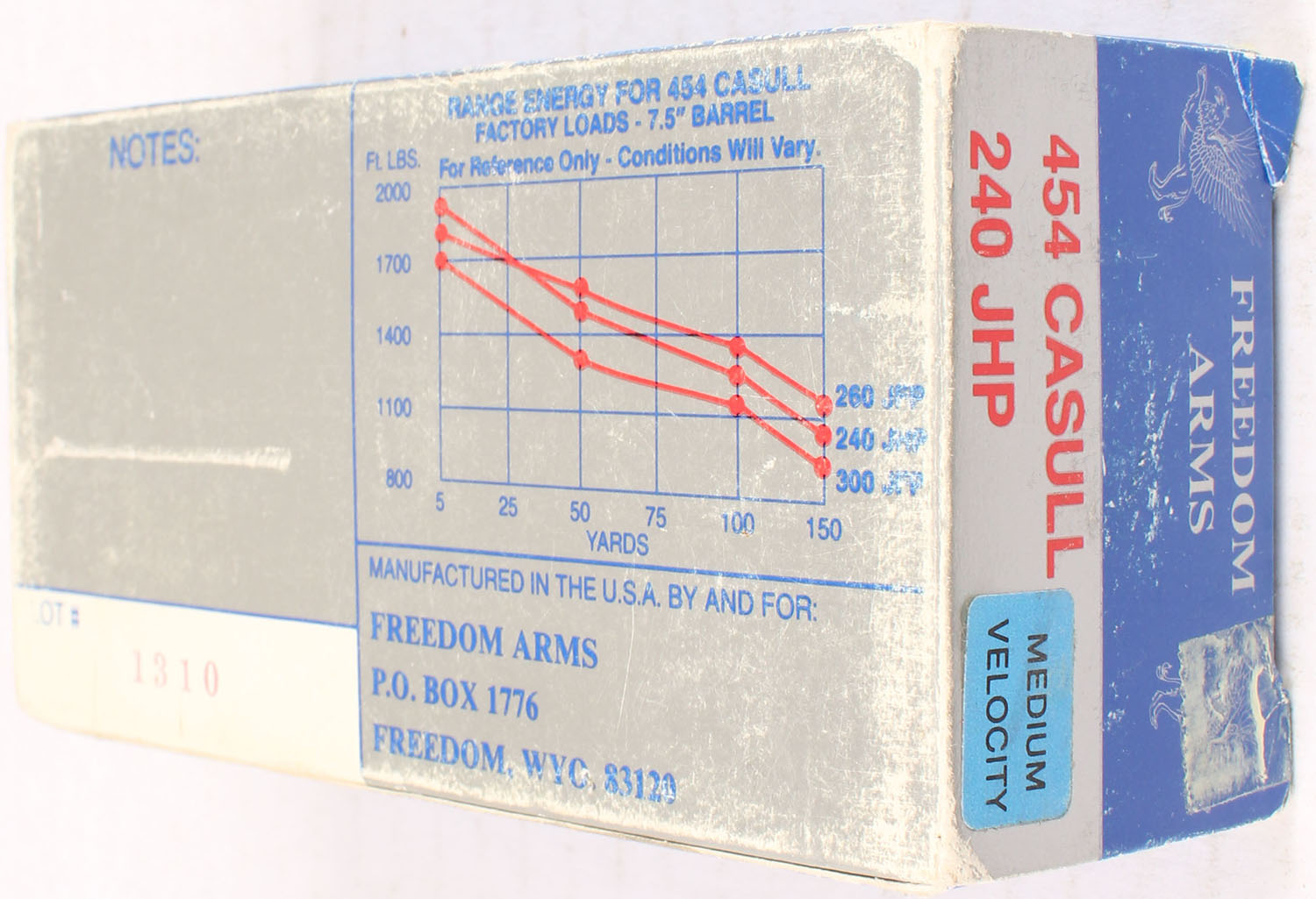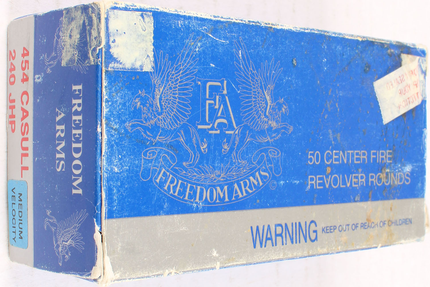 FA .454 Casull, 240 JHP, 1pc. multi-colored box, FULL, box has age soiling, Ammo is excellent. Grade: Very Good ++ - Value: 40 to 150