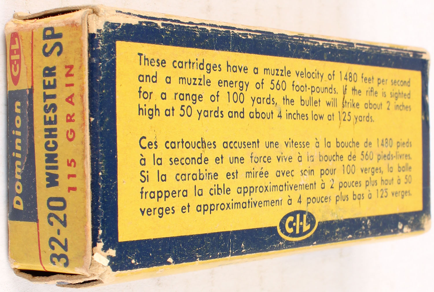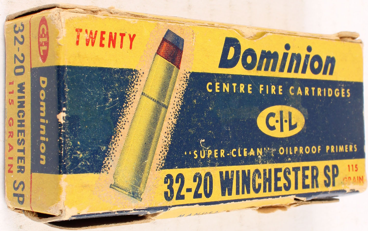 Dominion, .32-20 Winchester SP, 115 gr., 1pc, Full, multi-colored box, box is solid with some age soiling, ammo is excellent. Grade: Very Good ++ - Value: 40 to 100