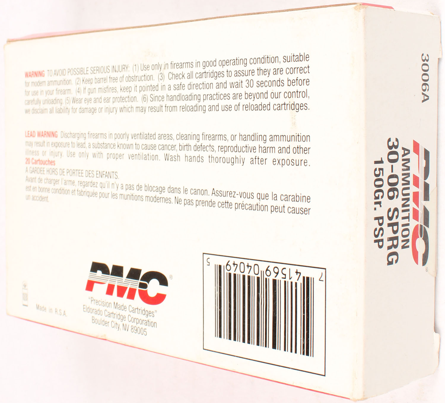 PMC, 30-06 sprg., 150 Gr. PSP, 1pc, Full, white/red box with black print, box is solid, ammo is excellent. Grade: Excellent + - Value: 10 to 40