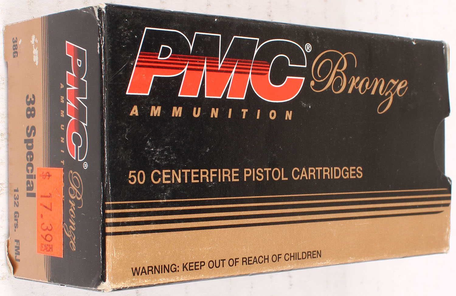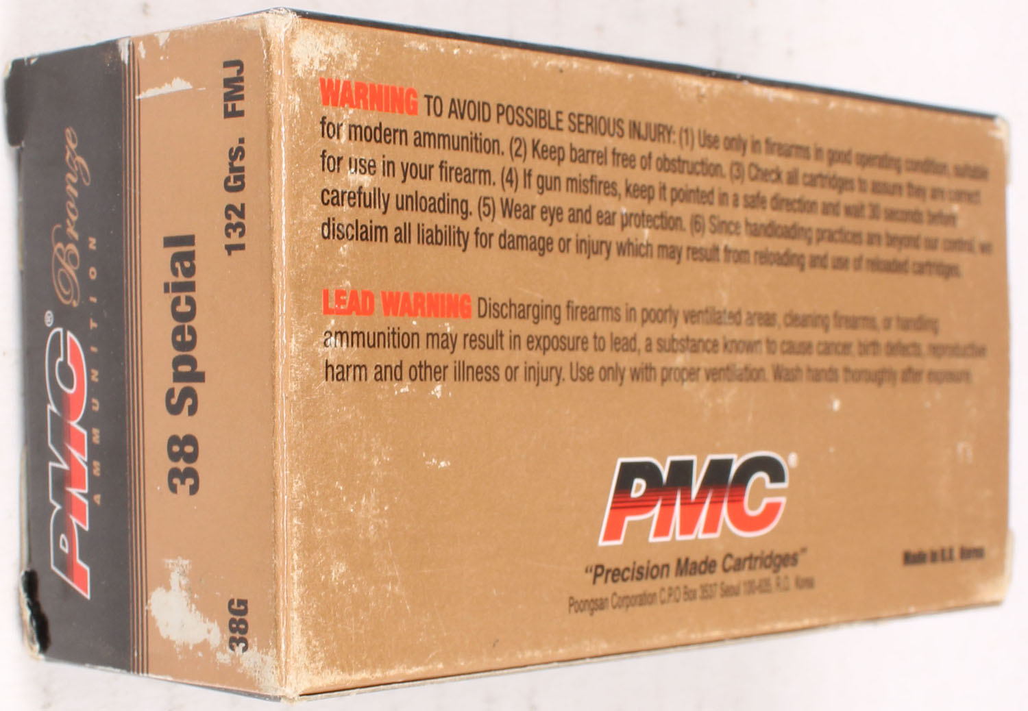 PMC, Bronze, .38 Special, 132 Grain FMJ, Full, 1pc., multi-colored box, box is solid with excellent color, Ammo is excellent. Grade: Excellent - Value: 10 to 40