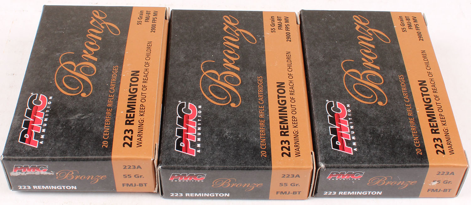 Lot of 3 PMC, Bronze, .223 Remington, 55 Grain FMJ-BT, Full, 1pc., multi-colored box, box is solid with excellent color, Ammo is excellent. Grade: Excellent - Value: 16 to 50